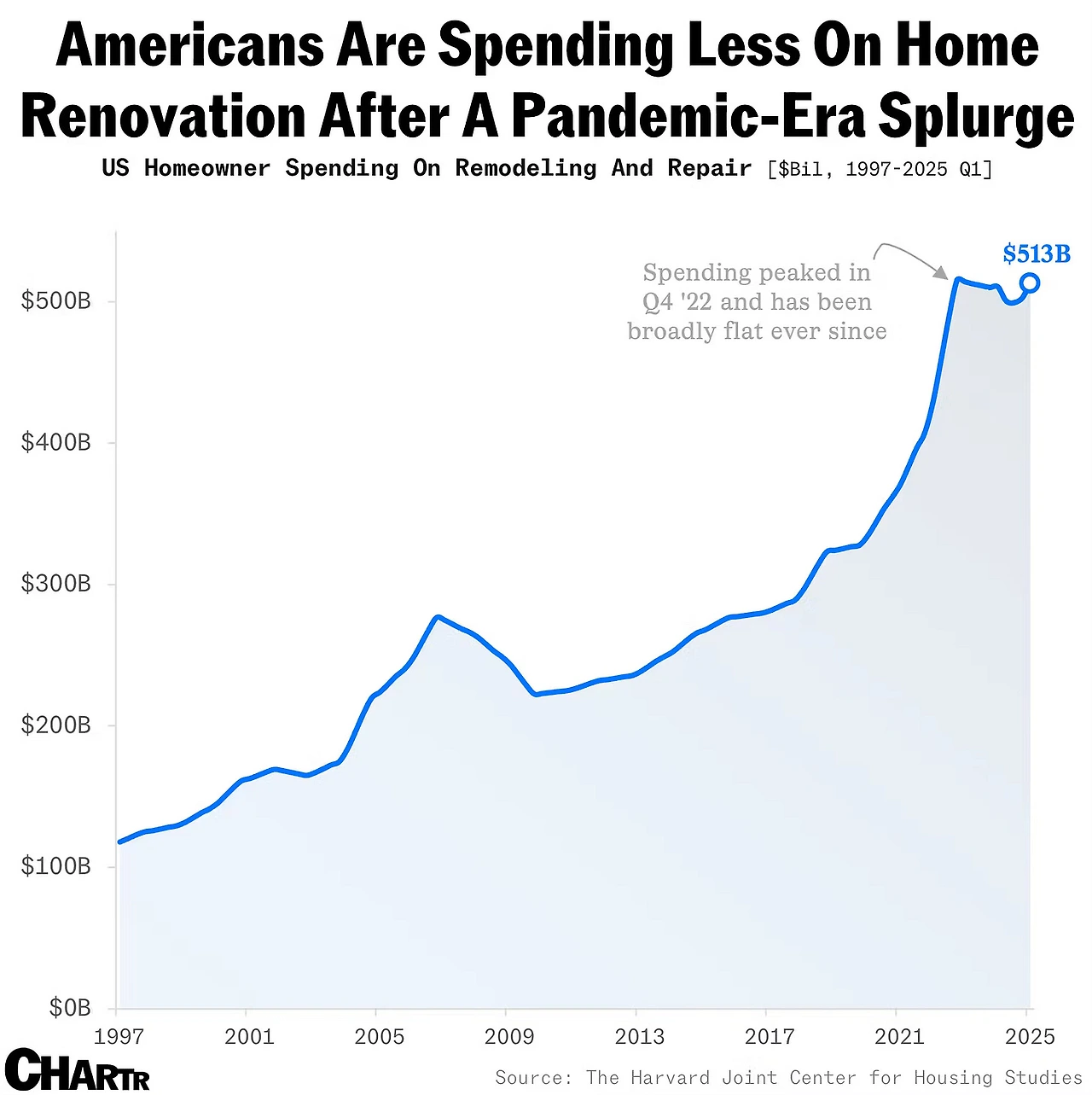 미국인들의 전례없던 홈 리모델링 광풍이 벽에 부딪혔다. 하버드 주택연구센터(Harvard Joint Center for Housing) 데이터에 따르면, 팬데믹 이전 3천억 달러 수준이던 미국 가정의 리모델링 지출이 2022년말 5천130억 달러 정점을 찍은 후 완전히 정체되었다. 2022년 4분기 이후 지출은 광범위하게 평평한 상태를 유지하고 있다는 게 연구센터의 분석이다.