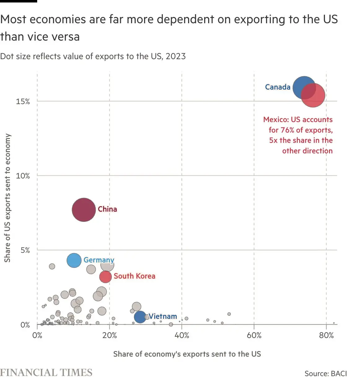 파이낸셜 타임스(Financial Times)에 의하면, 세계 각국이 얼마나 미국에 의존하고 있는지 한눈에 알 수 있다. 특히 미국의 이웃 나라들은 거의 생명줄을 미국이 쥐고 있는 수준이다. 멕시코는 전체 수출의 76%를 미국에 보내고, 캐나다는 무려 80%다.