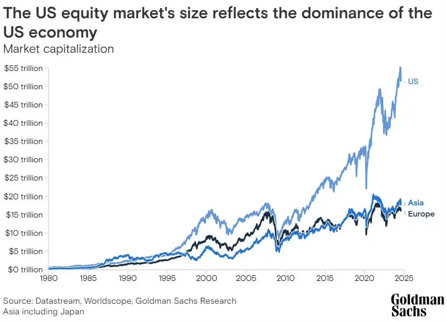 골드만삭스(Goldman Sachs) 차트가 보여주는 현실은 충격적이다. 미국 주식시장의 시가총액이 55조 달러를 넘어서며 아시아와 유럽을 압도하고 있다. 이는 단순히 큰 수준이 아니라 독점에 가깝다.