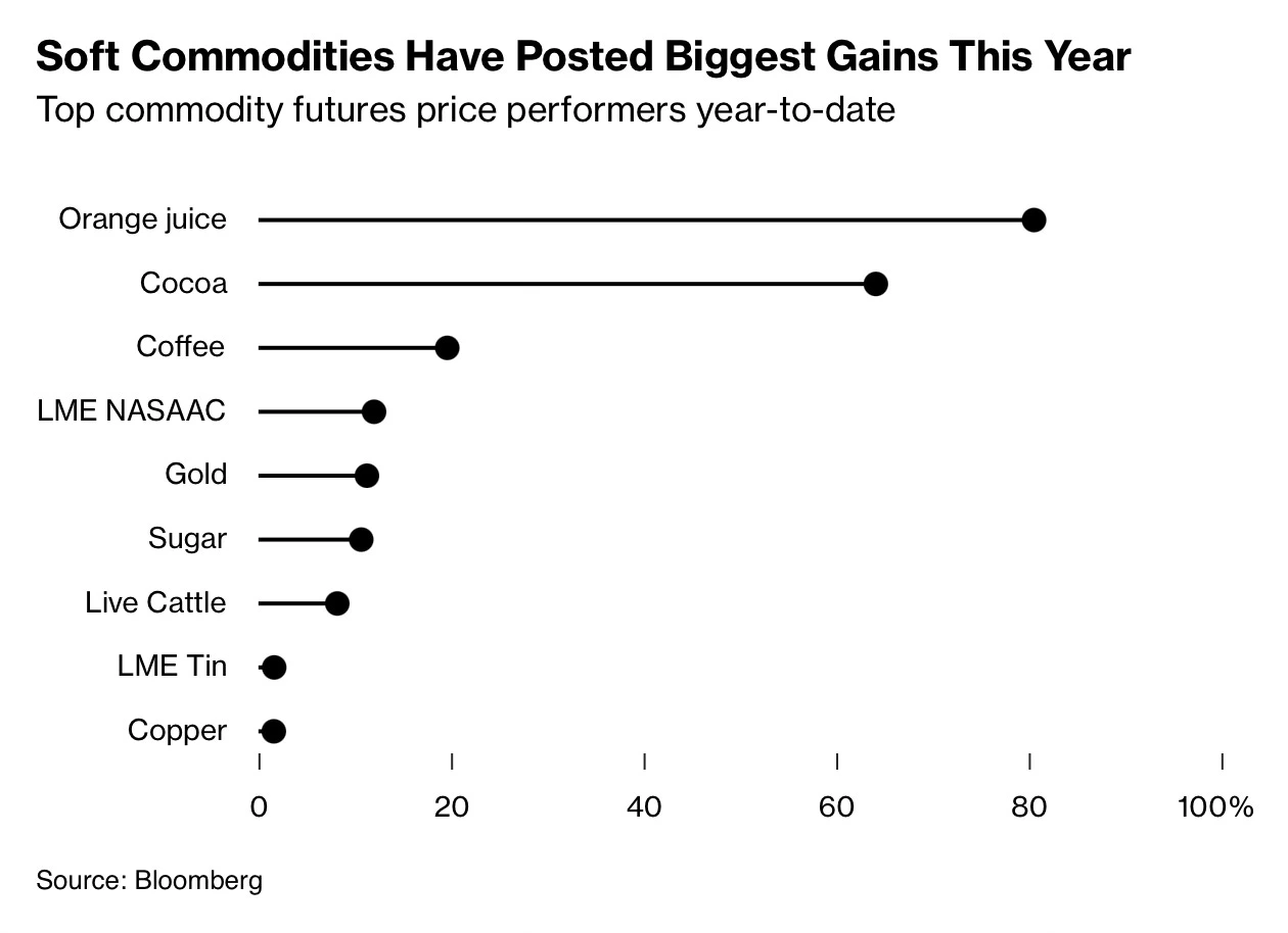 반면 금은 고작 10% 상승에 그쳤다. 말 그대로 오렌지 주스가 금보다 더 비싸게 오르고 있는 셈이다.