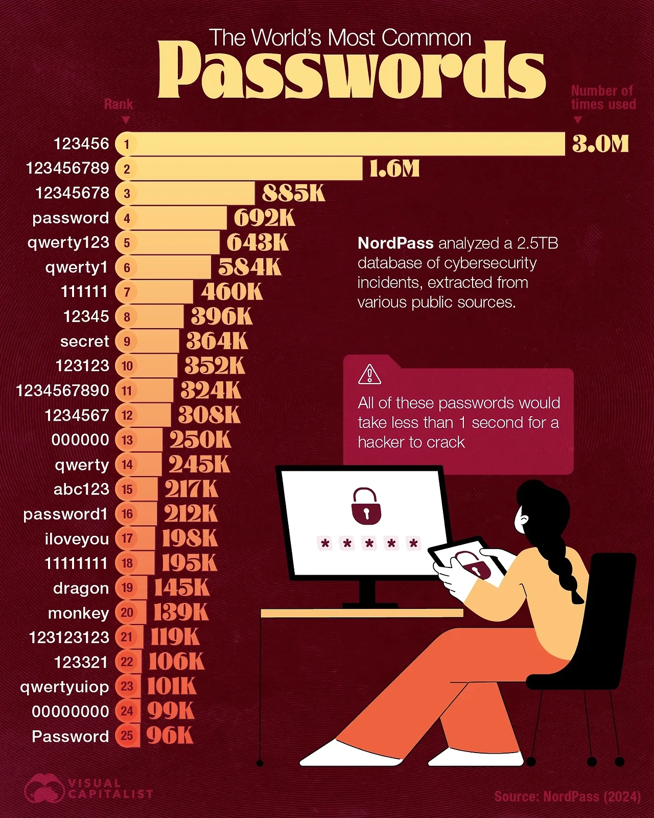NordPass가 2.5TB 규모의 사이버보안 사고 데이터를 분석한 결과다. 전 세계 사람들이 이렇게 뻔한 비밀번호를 쓰고 있다는 현실이 드러났다.