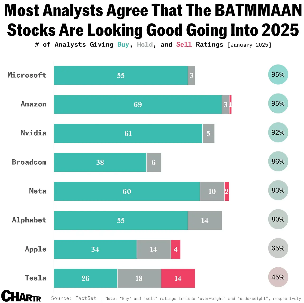 BATMMAAN 주식(빅테크 8개 종목, Broadcom, Amazon, Tesla, Microsoft, Meta Platforms, Apple, Alphabet, Nvidia)에 대한 애널리스트들의 의견이 놀라울 정도로 일치하고 있다. 아마존을 커버하는 73명 중 무려 69명(95%)이 매수(Buy) 의견을 내고 있다. 중립(Hold)은 3명, 매도(Sell)는 단 1명뿐이다.