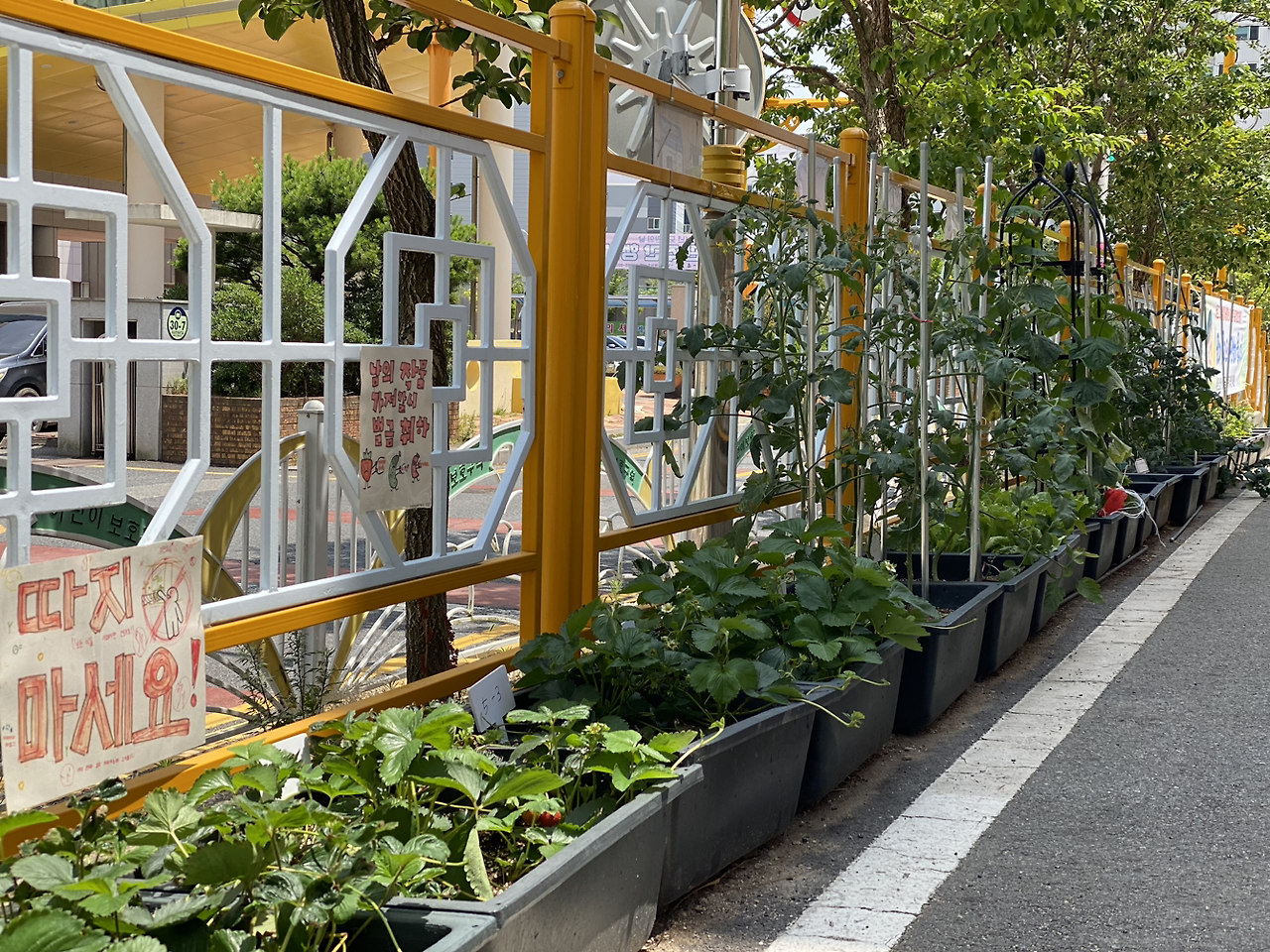 텃밭은 만들어 주지 못하지만, 작물을 심을 수 있는 큰 화분을 외부에 놓아 원하는 학급이 심고 관리할 수 있다.