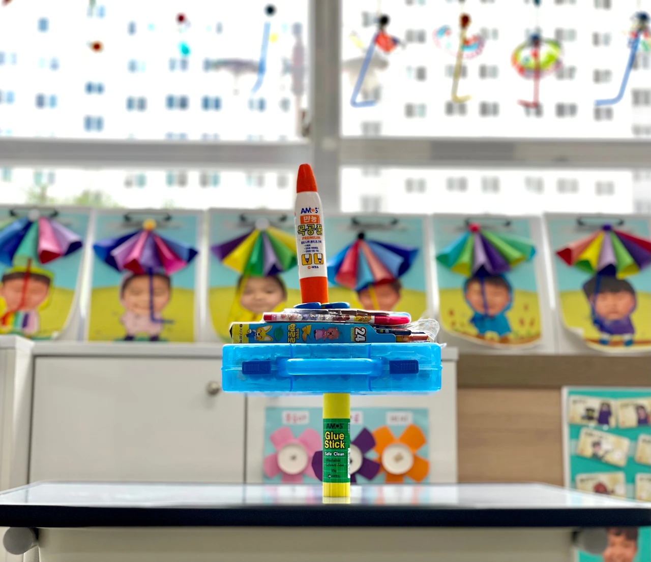 그 위에 살며시 필통을 올리자 이내 와르르 무너진다.