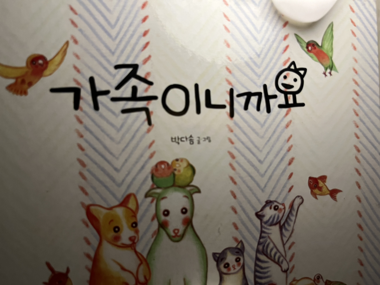 우연히 발견한 <가족이니까요>, 책은 반려동물을 가족으로 묘사한다. 가족 구성원과 형태도 다양하다. 아이가 화자가 된 것처럼, 동물이 아이의 시각으로 가족의 당당한 구성원으로서 말한다. 그들 모두는 다 다르지만 사랑받고 있다. 구성원 모두가 서로를 가족으로 따스하고 살뜰히 챙겨준다.