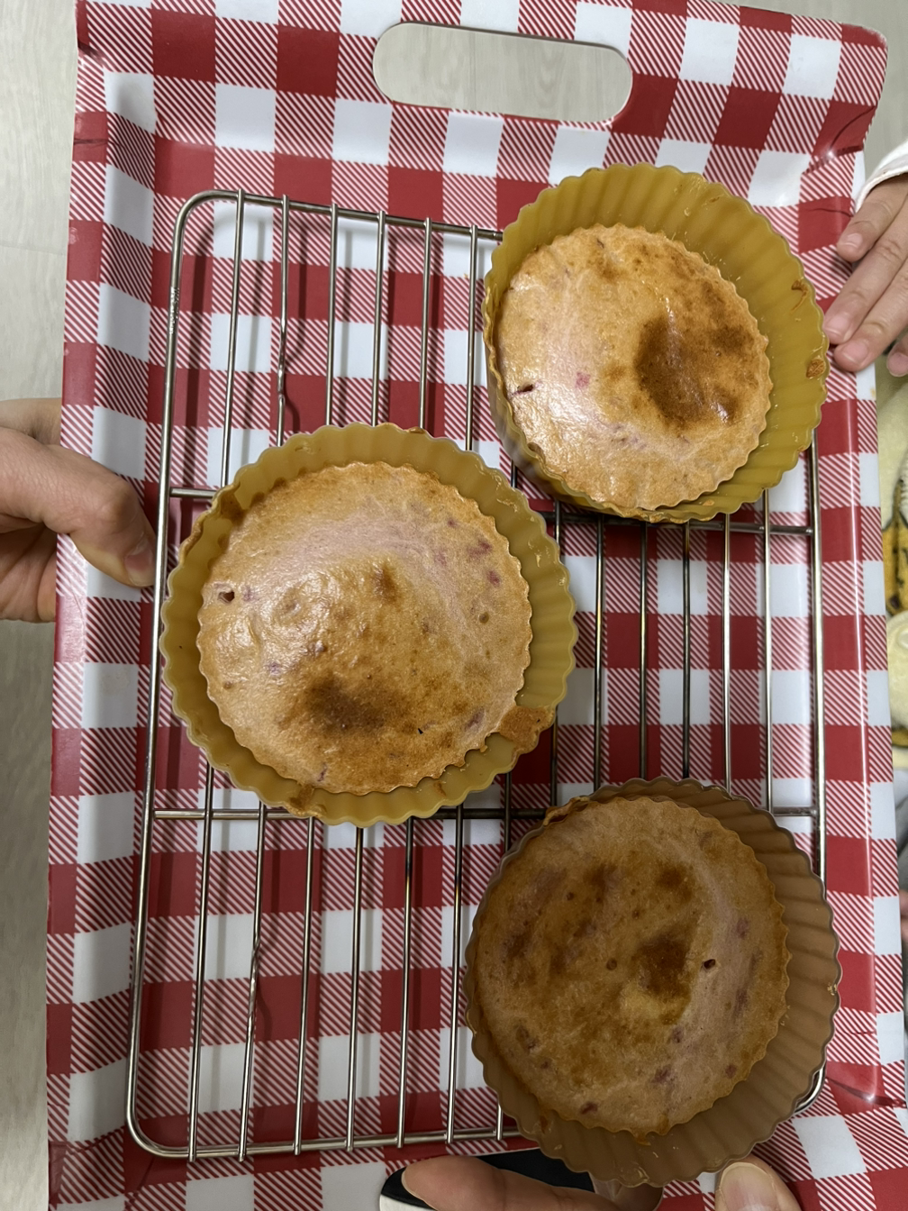 재료가 비교적 간단한 편이라, 대략적인 계량?을 해주고 신나게 딸기 으깨서 섞기를 열정적으로 하는 아이는 굉장히 신나 있었다.(잔해는 남지만) 실리콘 머핀틀에 반죽을 담는 것까지는 괜찮았다. 문제는 에어프라이어에 본인 손으로 넣어보고 싶은 거다. 자그마치 160도 내외의 온도로 돌아가고 있는 기계에 말이다. 오븐 장갑을 끼고 싶어 했지만, 찰랑이는 실리콘 틀을 에프에 꽉 차게 가까스로 넣기에는 너무 위험했다.