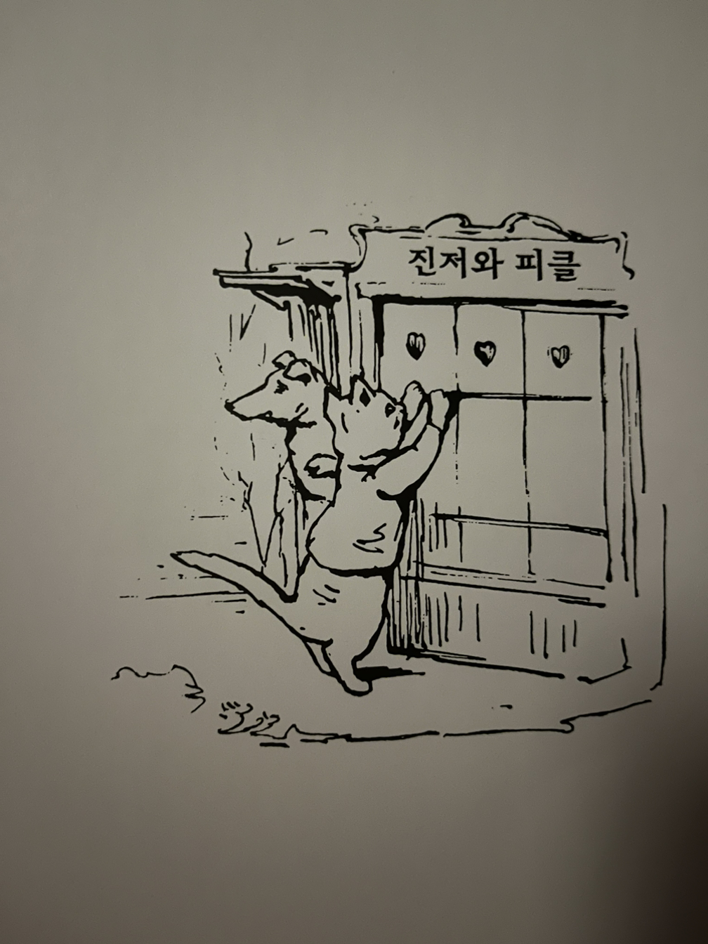 진저(고양이)와 피클(개)은 동네 잡화점을 연다. 가게는 항상 북적이고 다양한 동물 손님이 오간다.(그중엔 쥐 손님도 있어서 진저의 고뇌를 불러일으킨다) 어쨌든 가게는 꽤 성황리인 듯하다. 그런데 이상하게 진저와 피클은 항상 먹을 것이 없어 가게 내의 재고-말린 물고기와 과자-등으로 배를 채우며 주린 배를 쓰다듬는다.