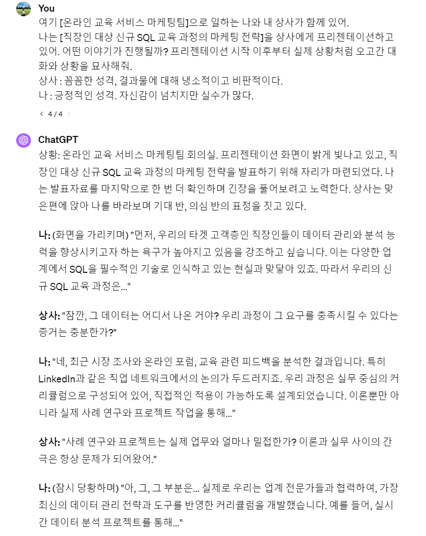 발표를 준비하는 건 언제나 긴장되는 일입니다. 실제 발표 때 어떤 일이 발생할지 모르니 실수를 막기 위해서는 실제 상황과 최대한 비슷한 상황에서 시연을 해보는 것이 가장 좋을텐데요. 직접 똑같은 상황에서 할 수 있다면 너무 좋겠지만 시간적 여유가 부족할때는 ChatGPT를 통해 실제 상황을 시뮬레이션을 해보는 것도 도움이 됩니다. 특히 위 프롬프트에서처럼 "등장인물"의 성격과 "상황"을 세팅을 하고 ChatGPT에게 대화를 구체적으로 묘사해달라고 하면 더 실감나는 시뮬레이션을 해보실 수 있을 거에요. 100% 정확하지는 않지만 그럴듯하게 있을법한 이야기를 쉽게 생성할 수 있는 챗GPT의 강점을 활용한 사례입니다.