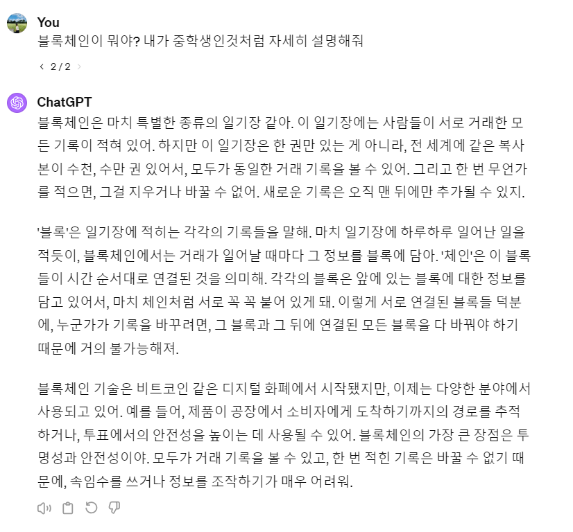 비트코인, 블록체인, 경제용어 등등 복잡한 개념을 쉽게 이해하고 싶으신 적이 있으신가요? ChatGPT의 강점인 "바꿔말하기"능력을 십분 활용해, 어려운 개념을 N살짜리를 가르치듯이 쉽게 설명해달라고 요청해보세요. 어떤 개념도 쉽게 풀어서 맞춤 과외를 받으실 수 있을거에요. 이미 많은 분들이 활용하고 있는 실용성 높은 프롬프트이니 아직 써보지 않으셨다면 한 번쯤 활용해보시기 바랍니다.