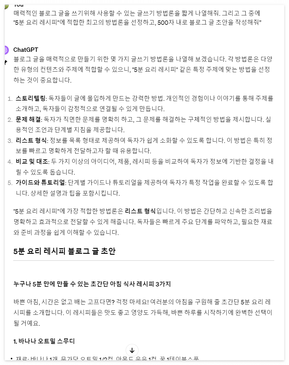 생성형 Ai에게 글쓰기를 요청해본 적이 있지만 생각만큼 괜찮은 결과를 받지 못했었다면, 위 프롬프트처럼 "글쓰기 방법론"을 먼저 생각해달라고 요청해보세요. 생성형 Ai에게 복잡한 업무를 요청할때에는 기준점이 될수 있는 방법론을 함께 주는게 좋습니다. 예시의 경우, "5분 요리 레시피" 라는 블로그 주제에 맞는 글쓰기 방법론을 먼저 선택해서 써달라고 요청했는데요, '리스트형식' 이라는 방식을 선정해 글의 생성해줍니다. 단순히 블로그 글을 써달라고 하는 것보다, 그 주제에 맞는 글쓰기 방법부터 고민해달라고 먼저 요청함으로써, 보다 주제에 맞는 유려한 블로그 글을 생성할 수 있는 프롬프트입니다.