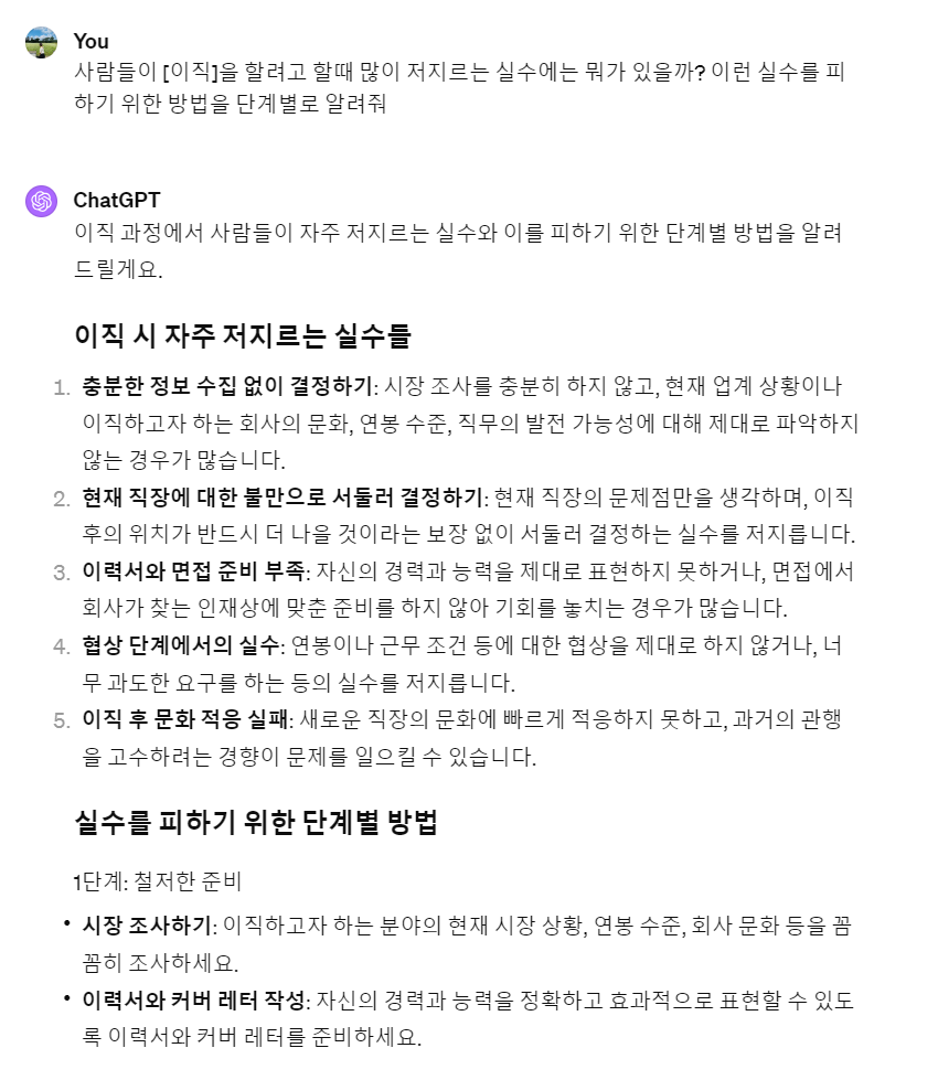 앞서 발표 시뮬레이션 예시처럼 실제 상황의 대화를 생성하도록 요청해서 예상되는 실수를 파악하는 것도 좋지만, 더 간략하게 "자주 저지르는 실수"가 무엇인지 물어보는 것도 좋은 방법입니다. 보다 간단하게 예상되는 난관을 한번에 파악할 수 있다는 장점이 있죠. 이와 같이 무언가를 예상하거나 시뮬레이션해야 하는 다양한 상황에서 ChatGPT를 유용하게 활용하실 수 있습니다.