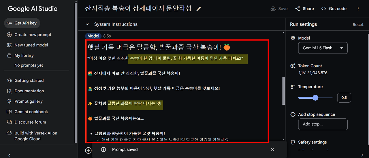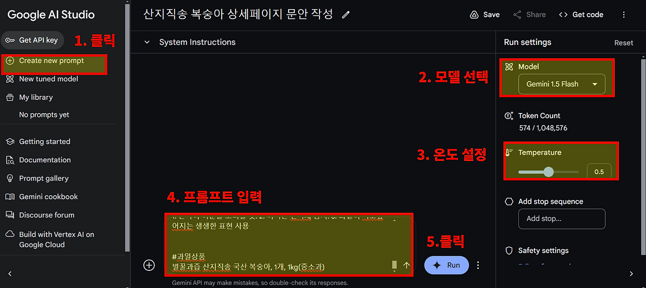 API를 가져다쓰기 전에, Gemini로 생성된 상세페이지 글이 어색하지는 않은지, 진짜 업무에 쓸만한 수준인지 미리 파악해두는게 좋겠죠? 이를 위해 Google Ai Studio에서 gemini의 성능을 확인해보겠습니다.