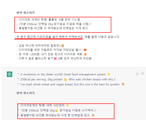 GPT에게 이모티콘을 넣어 꾸며달라는 요청을 했더니 문구에 어울리는 이모티콘을 알아서 붙여줍니다. 위 예시와 같이 GPT가 참고할 수 있는 예시 문구를 함께 넣어주면 좀 더 정확도가 올라갑니다. 이모지 하나하나 검색해서 찾는 것보다 훨씬 간편하고 여러 개를 한꺼번에 처리할 수 있어 사람이 하는 것보다 훨씬 빠르게 처리가 가능합니다.