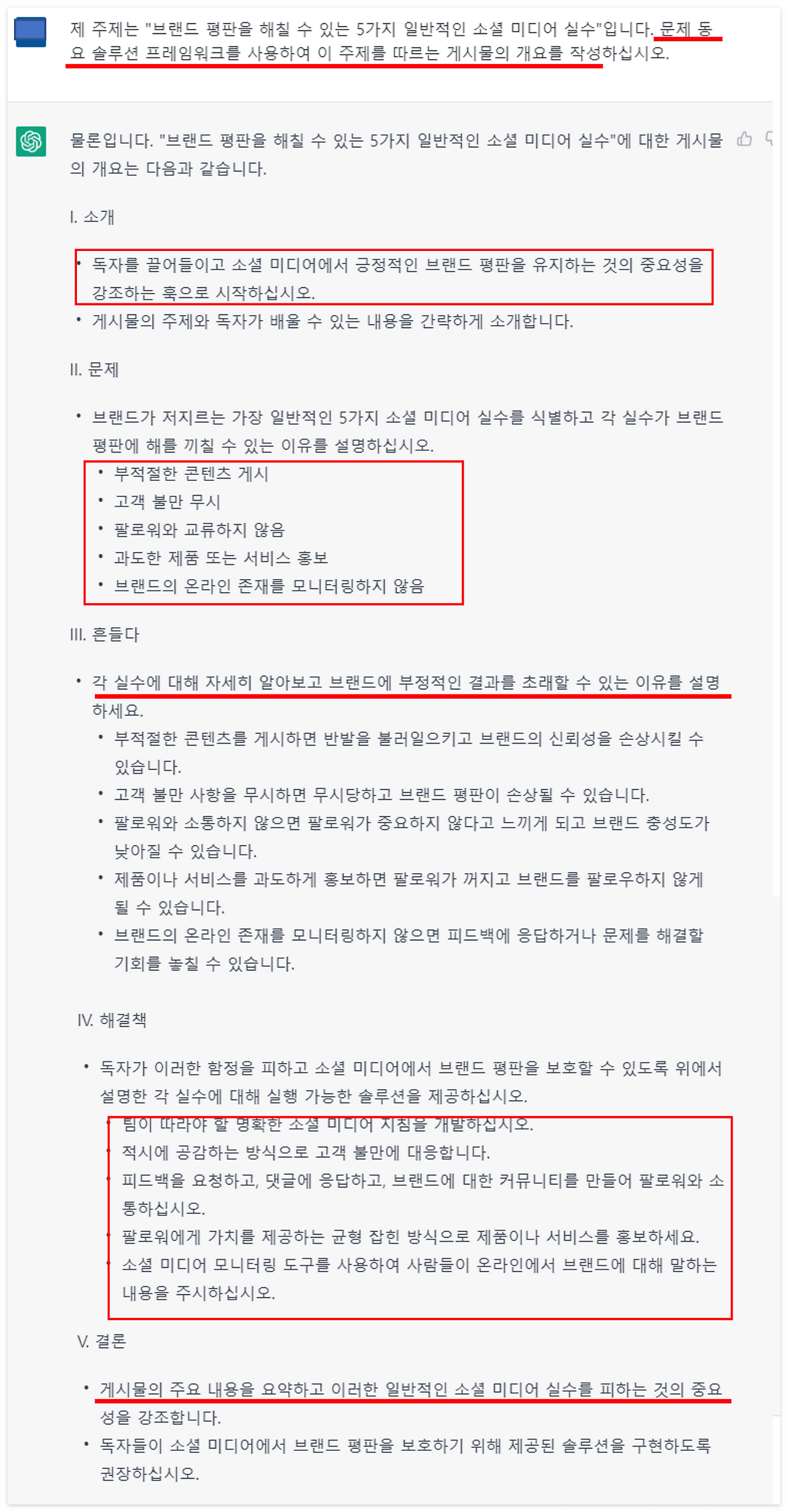 글 개요가 아주 자세하게 완성되었습니다! 가장 어려운 글의 도입부를 어떻게 써야할지부터, 글의 핵심주제인 5가지 실수가 왜 중요한지,그에 대한 거기다 해결책과 결론까지 작성되었습니다. PAS 방법론에 맞추어 작성을 요청하니 좀 더 글의 설득력이 한층 높아진 것을 확인할 수 있습니다.