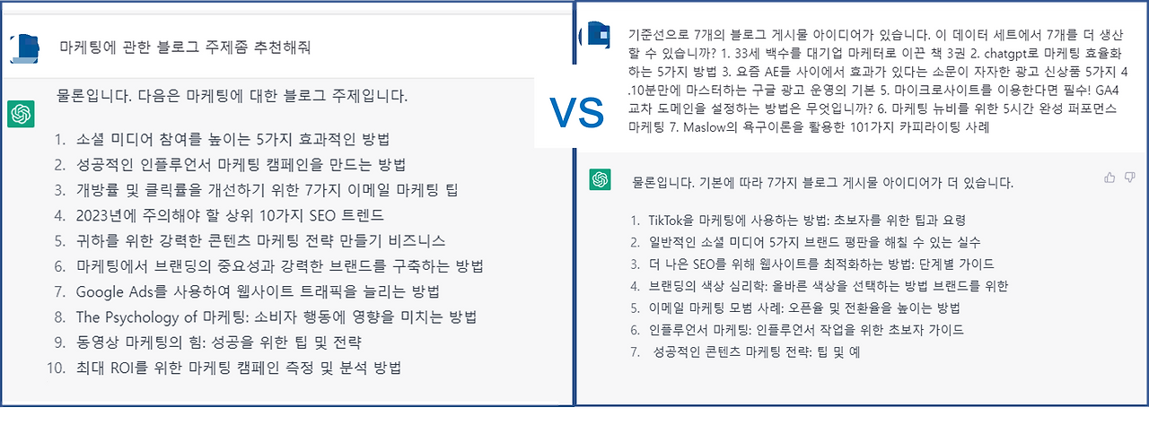 왼쪽 이미지는 마케팅 아이디어 아무거나 추천해 달라고 한 경우, 오른쪽은 기존에 썼던 주제를 알려주며 비슷한 아이디어를 생성해 달라고 한 경우입니다. 비교해 보면 오른쪽(기존 포스팅기반) 글감이 “5가지 브랜드 평판을 해칠 수 있는 실수" , "브랜딩의 색상 심리학 “ 등등 확실히 흥미로운 주제들이 많이 나온 걸 확인할 수 있습니다.