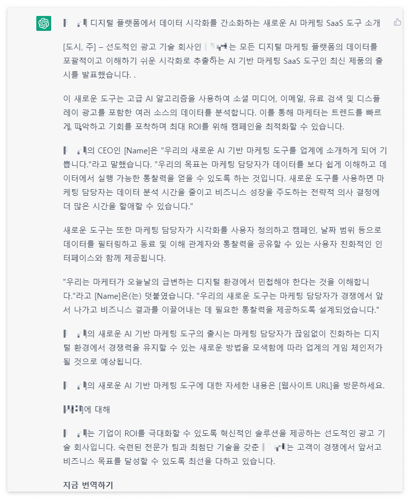백지상태에서 보도자료를 작성하기란 경험이 풍부한 마케터가 아니라면 쉬운 일은 아니죠. 이처럼 긴 글 작성이 필요할 때 ChatGPT가 유용하게 쓰일 수 있습니다.