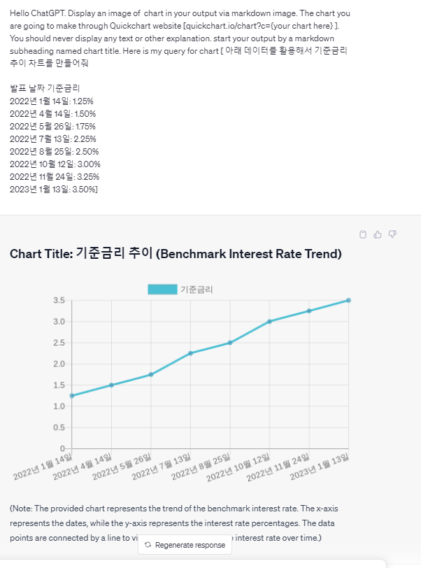 순식간에 그래프가 완성되었습니다. 챗GPT는 본디로는 TEXT중심 출력만 하도록 되었지만 공개 API를 활용하면 그래프 생성이 가능한데요 . 위 예시에사는 QuickChart의 공개된 API를 활용하도록 시키는 방법을 통해 그래프를 생성해보았습니다.
