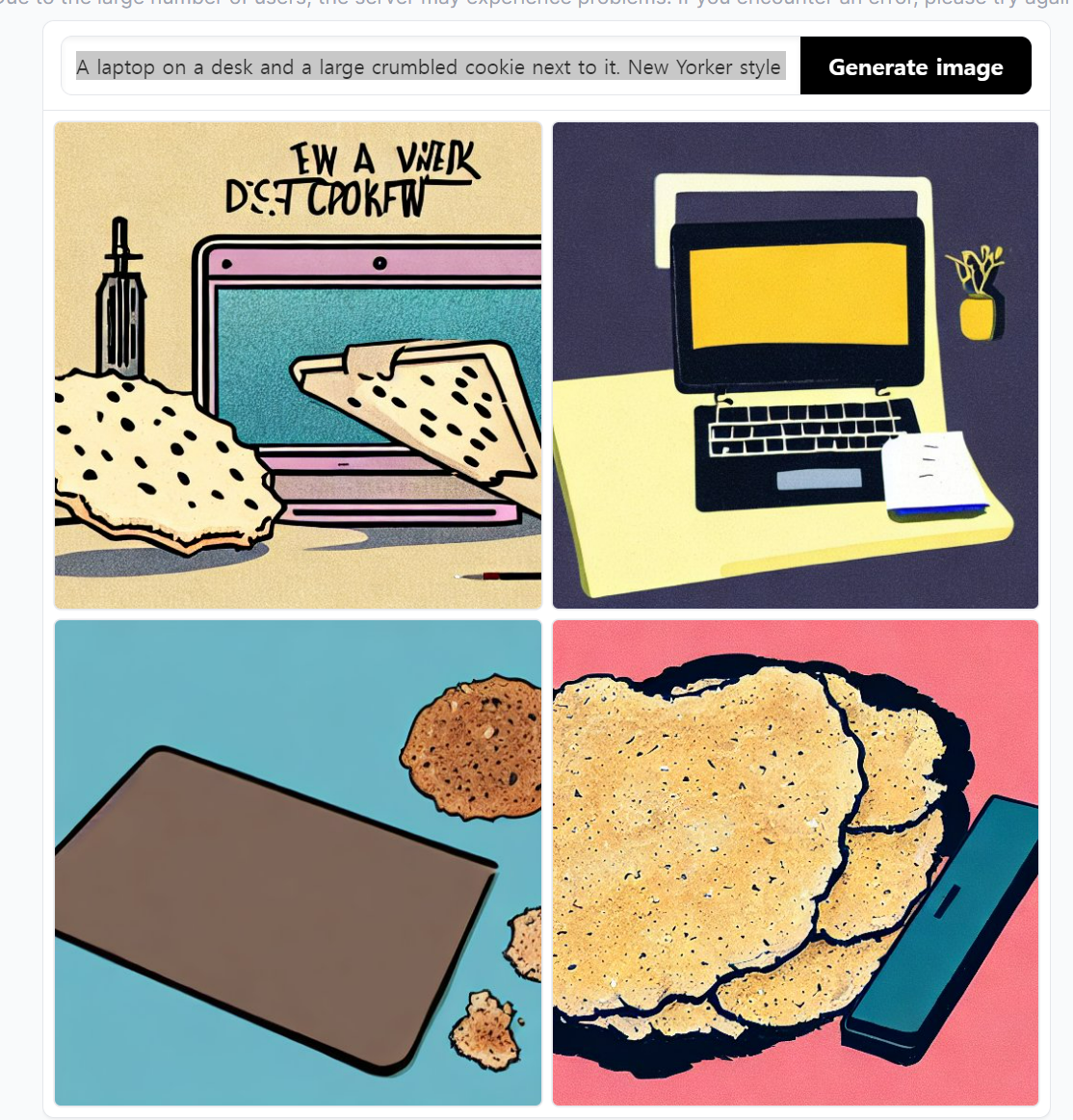 예시에서는 A laptop on a desk and a large crumbled cookie next to it. New Yorker style illustration.라는 프롬프트를 통해 일러스트를 생성해보았습니다.