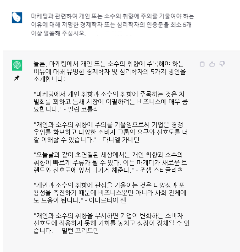 소수의 취향의 중요성에 관한 마케팅 명언을 알려달라고 했더니 챗gpt가 1분만에 관련된 명언들을 줄줄이 나열해 줍니다. 찾아보신 분들은 아시겠지만 이렇게 내 의도에 딱 맞는 명언 찾기는 검색엔진으로는 시간이 굉장히 오래걸리는데요, ChatGPT를 활용하면 의도에 맞는 유명인 어록을 보다 빠르게 찾으실 수 있답니다.누군가를 설득하고자 준비하는 마케터분이 계시다면 실제 설득에 들어가기전에 GPT에게 근거자료로 쓸만한 적절한 명언을 찾아달라고 한번 물어보는 건 어떨까요?