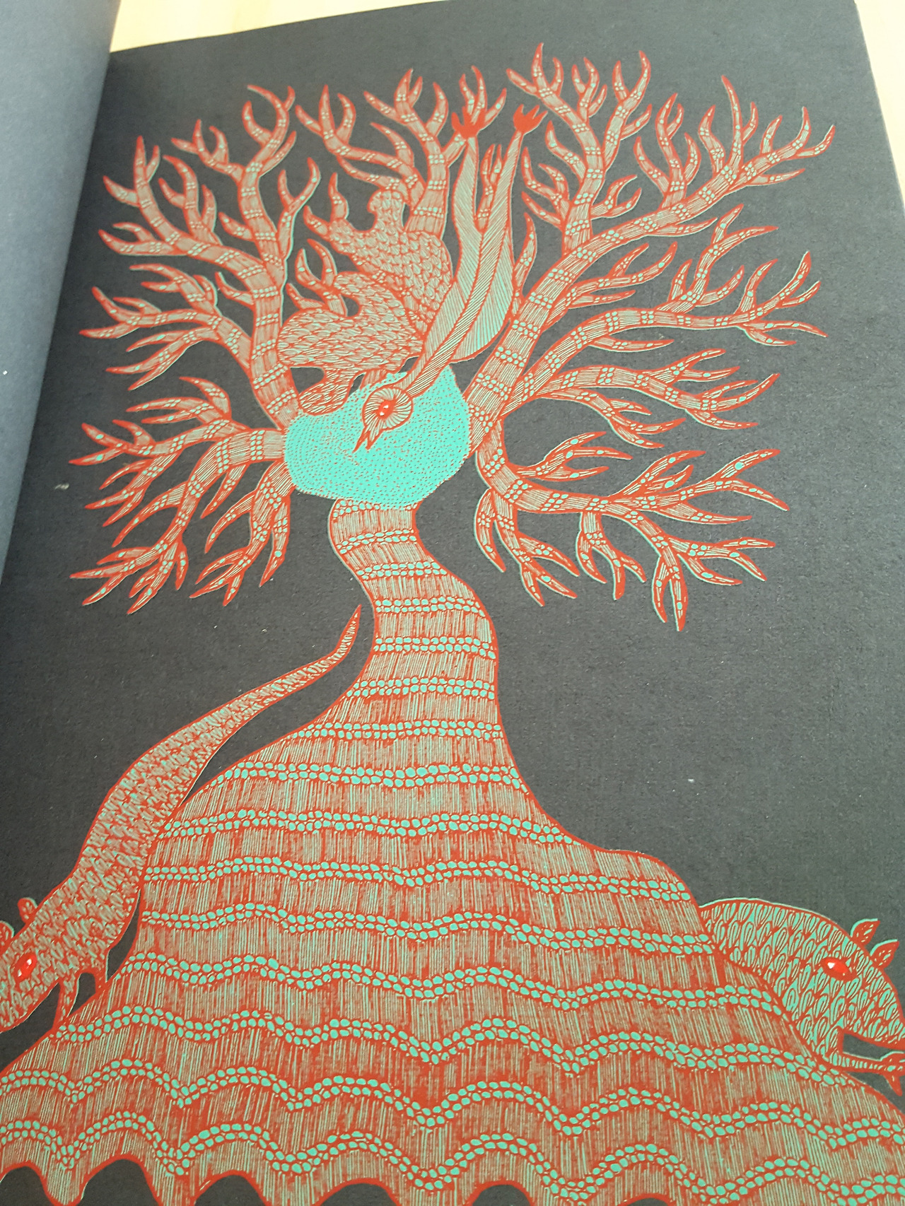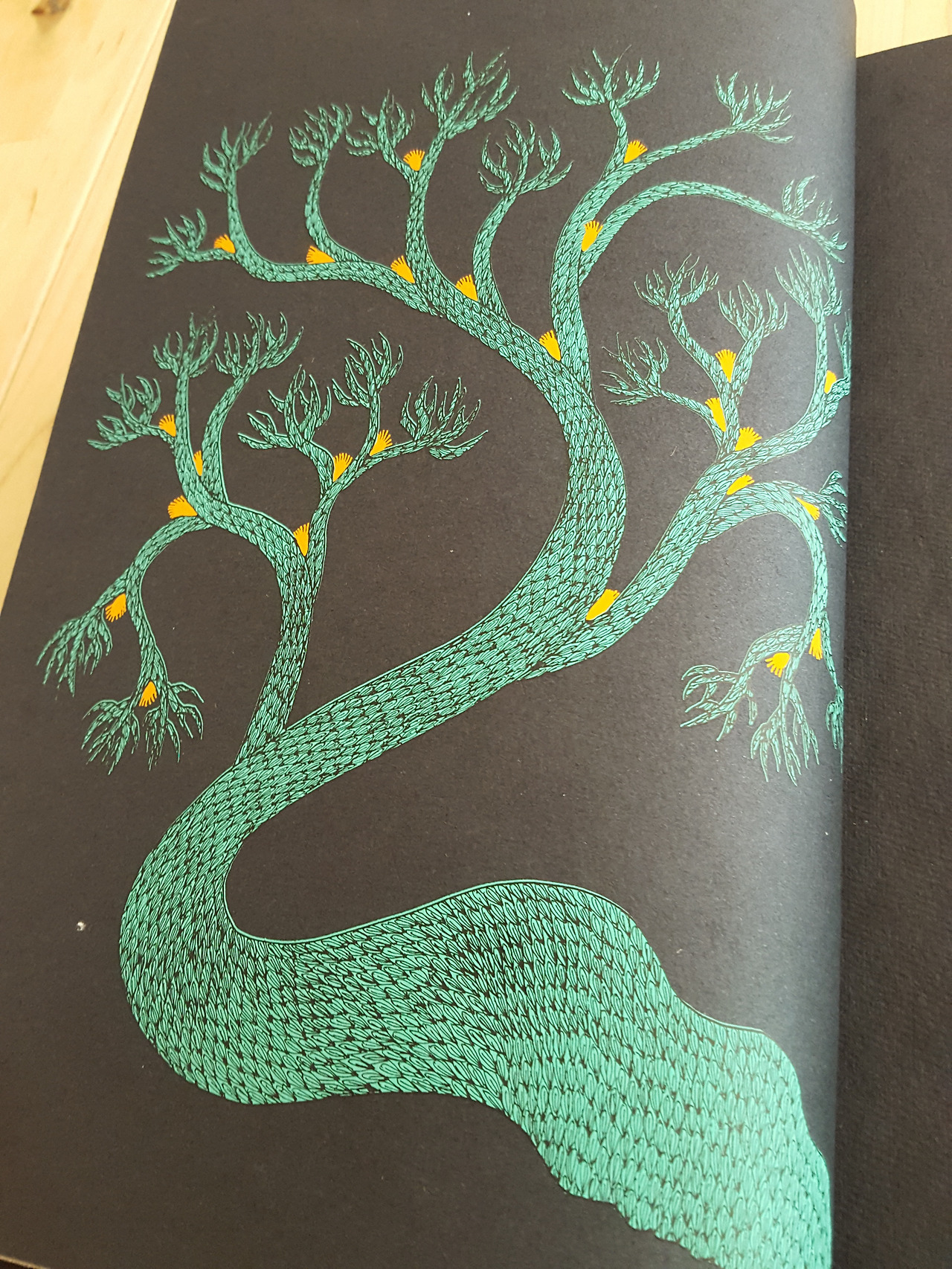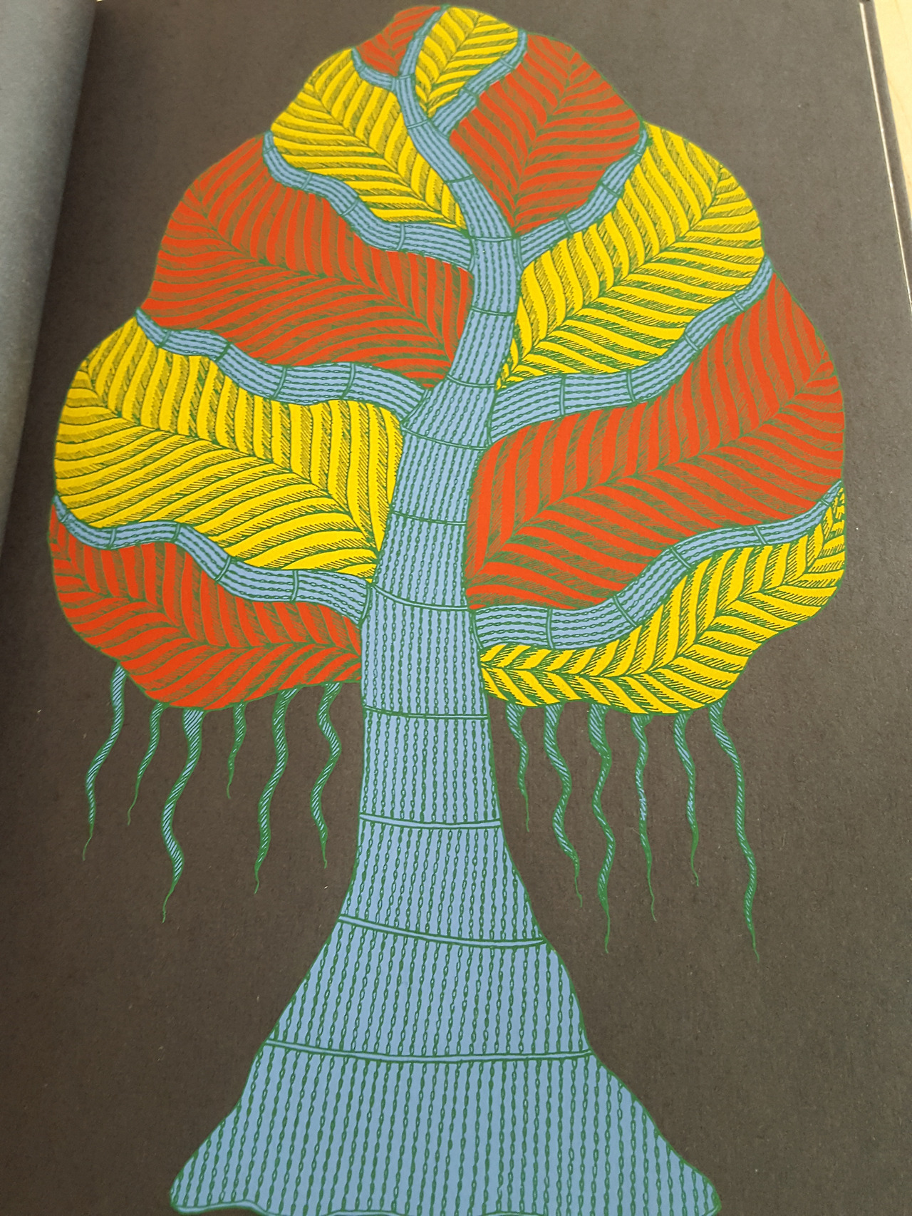 인도의 소수민족 곤드족 화가 세 사람이 그렸다. 곤드족 마을에는 세 개의 자티(커뮤니티)가 있다. 농사일을 하는 곤드, 소를 키우는 아히루, 농사와 함께 음악과 그림을 즐기는 프라단.