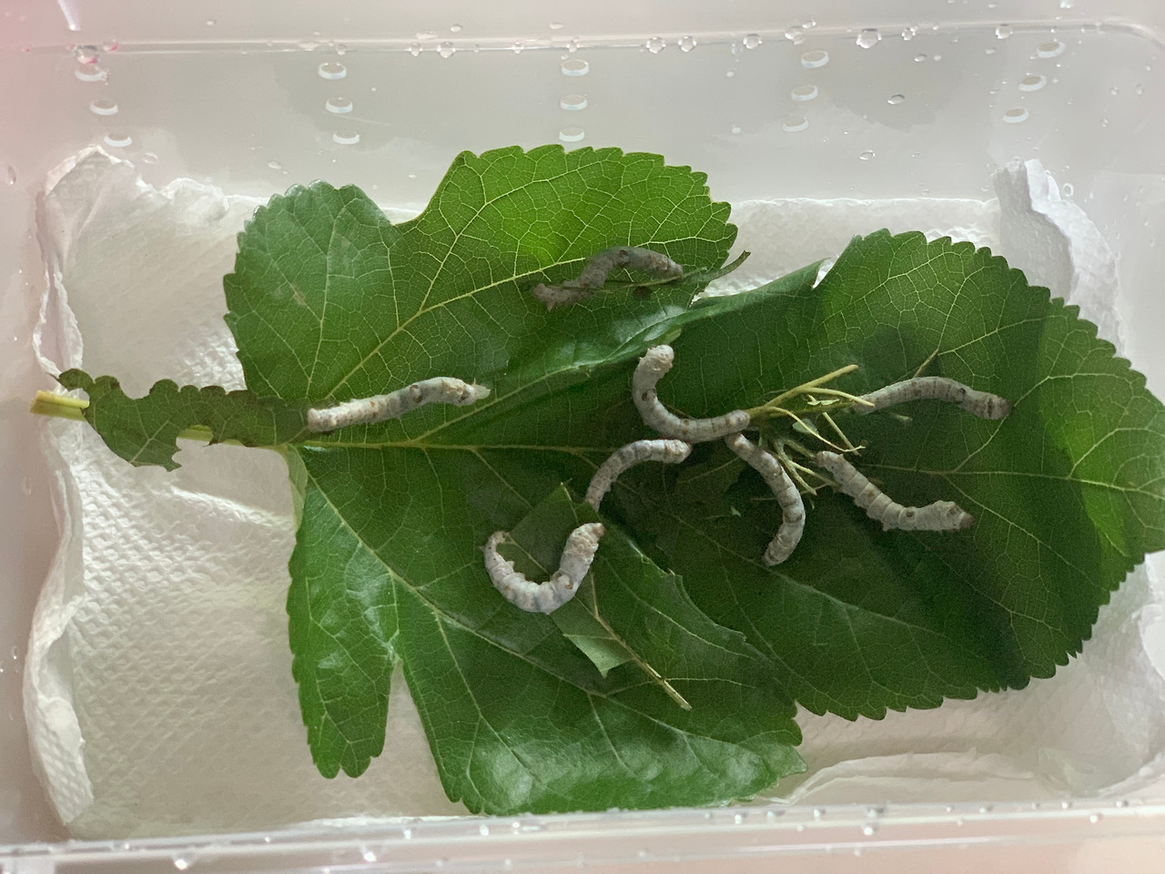 젖은 뽕잎을 먹으면 누에가 아플 수 있다고 해서, 키친타월로 물기를 꼼꼼히 닦아내고 누에 크기에 맞게 뽕잎을 잘게 잘라 하루 세 번 급여했다. 누에는 세상 편식쟁이라서 뽕잎만 먹는다. 그런데 누에똥은 신기하게도 정말 냄새가 전혀 나지 않는다. 그것마저 너무 신기했다.