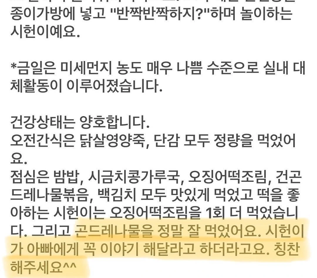 어린이집 선생님께서 써주신 알림장을 읽었다.