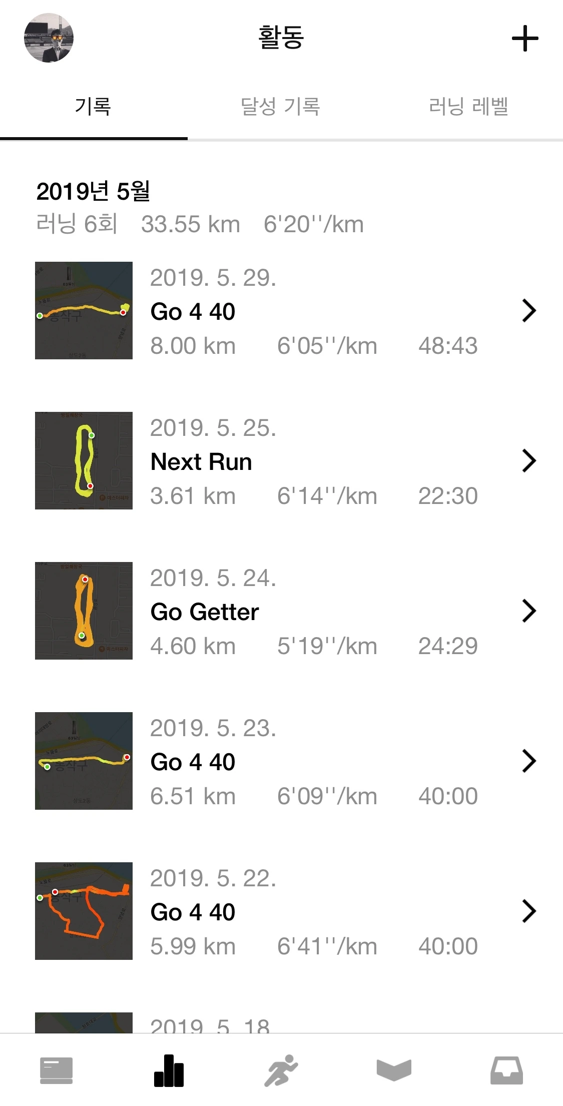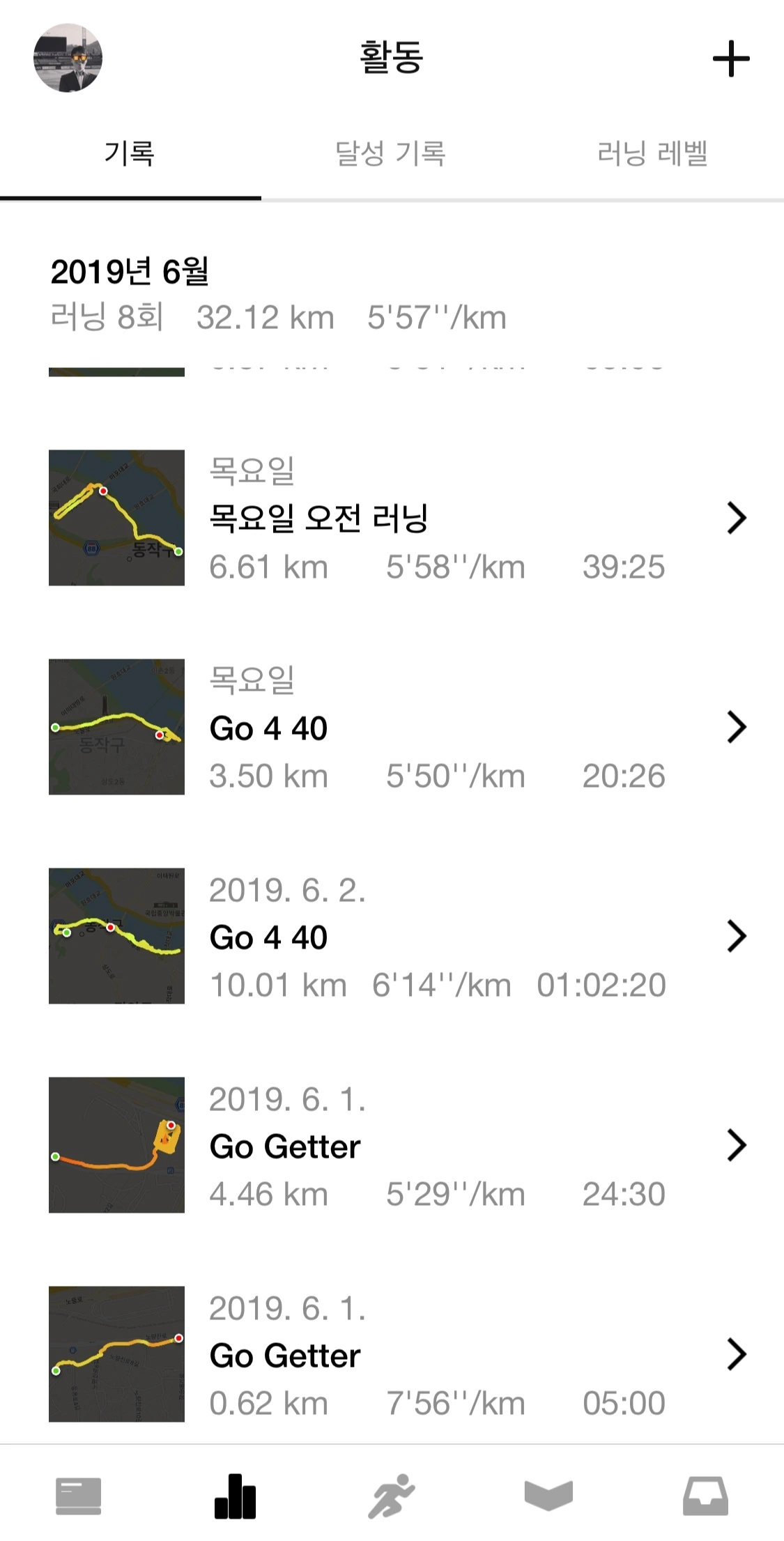 그랬던 제가 2019년 5월에만 6회의 러닝을 했고, 33.55km를 달렸습니다. 31일 중 6일이니 횟수로 보면 많은 것이 아닌데, 5월 18일 첫 러닝을 시작으로 2주 만에 여섯 번을 달렸으니 적은 것도 아닙니다. 2019년 6월 현재까지 8회의 러닝을 했고, 32.12km를 달렸습니다.