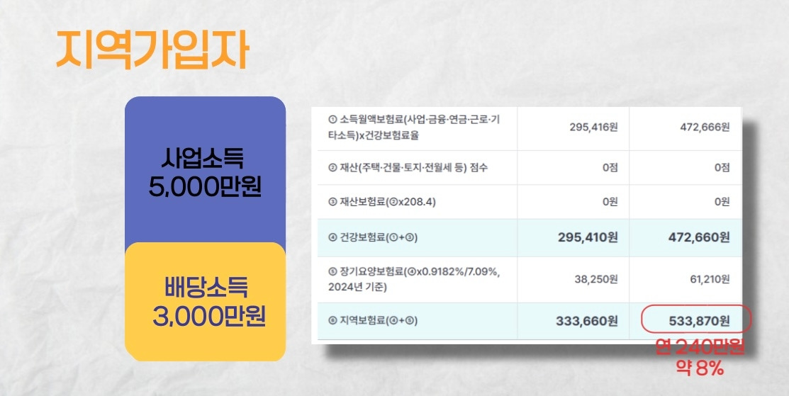 배당소득 금액과 무관하게 사업소득에 대해서만 약 33 만원을 매달 건강보험료로 납부하게 됩니다.
