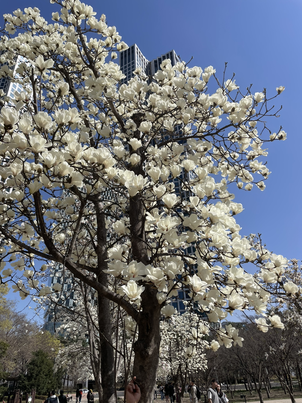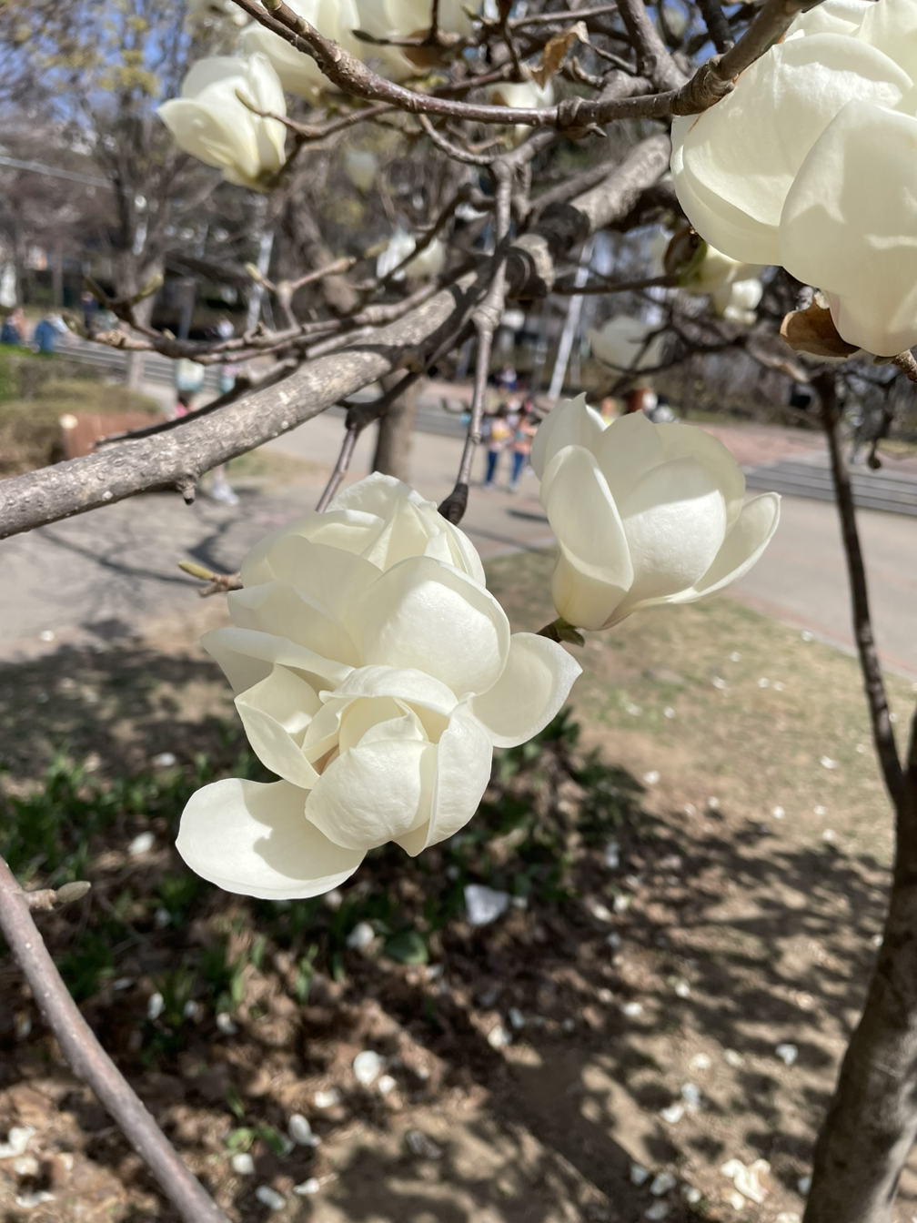 가족마당 광장에 살구나무 무리가 분홍빛으로 물들 무렵, 서울숲 입구 주변에 모여있는 목련도 절정에 다다른다. 서울숲이 한층 환해지는 순간이다.