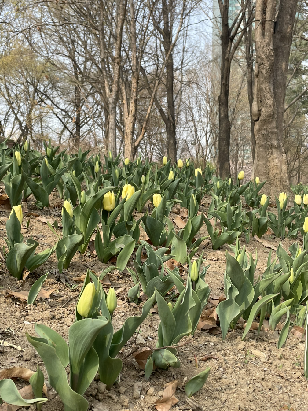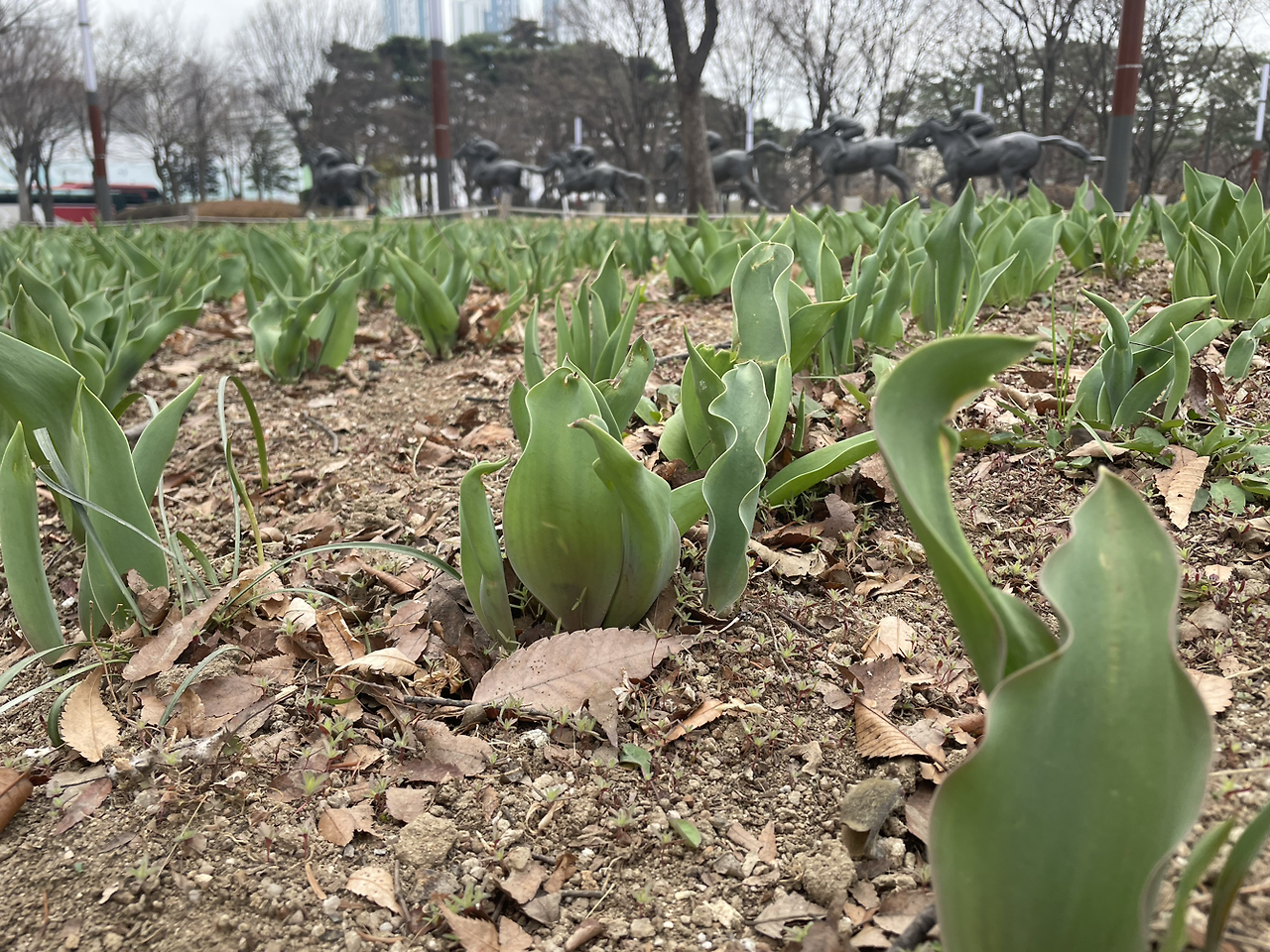 그다음으론 일렬로 줄지어 튤립 싹이 고개를 내민다. 누가 언제 심었는지 매번 궁금해하며 하루하루 자라난 싹을 관찰한다.