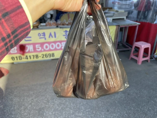 인월 장터 오일장은 3일, 8일에 열린다. 규모가 대단히 크진 않지만 있을 건 다 있다. 11월 두 번째 주말을 앞두고 김장준비를 하려는 사람들로 북적였다. 여기저기 소복히 싸여있는 배추와 무, 새우젓과 마늘, 청각, 양파 등이 눈에 띄었다. 끝지점까지 쭉 직진하여 군것질거리를 유심히 살펴보았다. 꽈배기 집이 세 곳, 어묵 두 곳, 호떡 한 곳 정도 보였다. 전부 깨끗하니 시골 장터라고는 믿기지 않았다. 어느 부부가 운영하는 꽈배기 집에 멈추어 섰다. 빨간 머리 두건과 양 손에 낀 비닐장갑이 믿음직스러웠다. 오천원 한 봉지에 꽈배기와 찹쌀도너츠를 반씩 담았다.