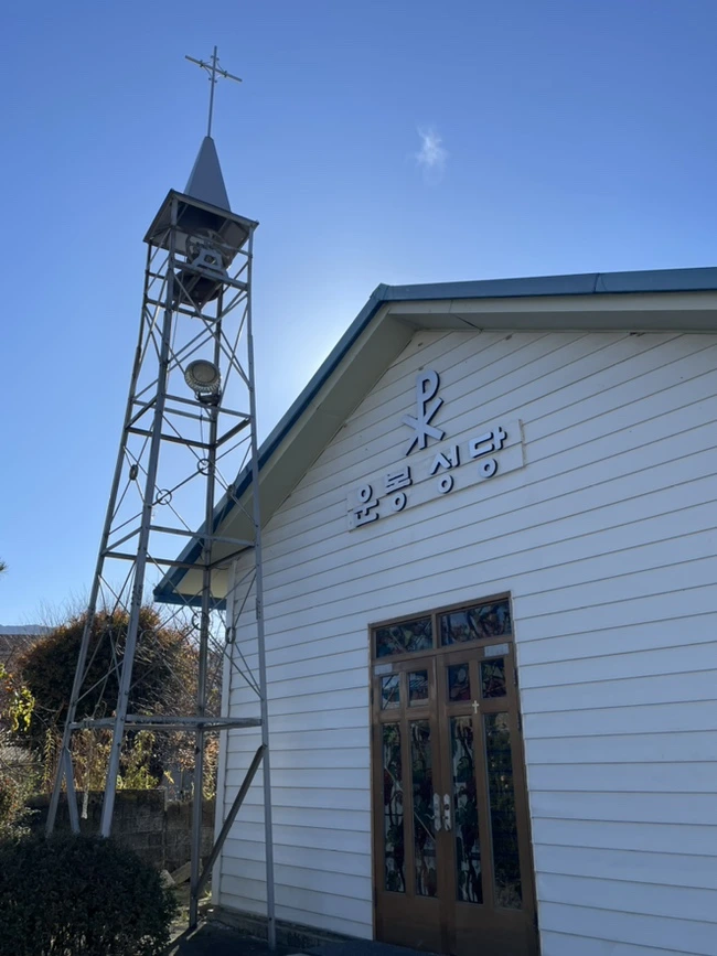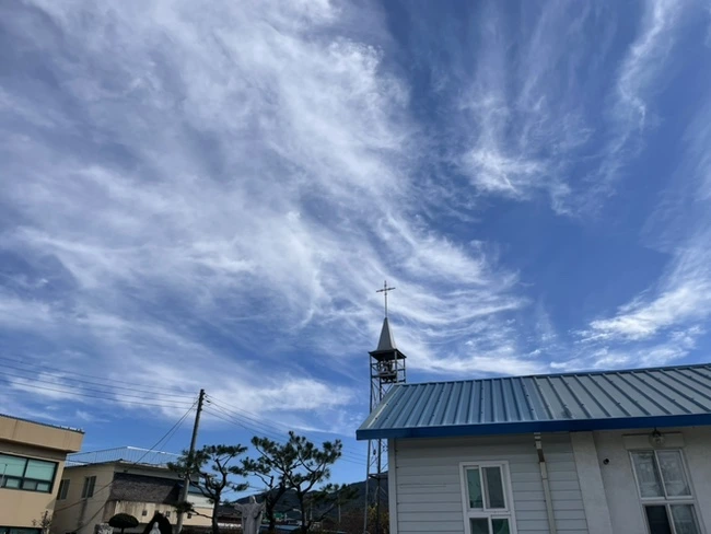 한 달 살기 4주 차에야 읍내에 있는 성당을 찾아갔다. 마침 읍내로 나가는 버스 시간이 딱 맞아서 주중 오전 미사에 참여할 수 있었다. 읍사무소에 내려 고요한 길을 따라 걸어 내려갔다. 하나로마트가 있는 메인 도로가 아니어서였을까. 주중 10시 무렵 동네는 몹시 조용했다. 그저 바람 소리만 들렸다. 높고 푸른 하늘 위로 하얗고 기다랗게 수놓아진 구름이 나를 반겨주었다. 급격히 떨어진 기온에 새벽에 내린 눈도 보였다.