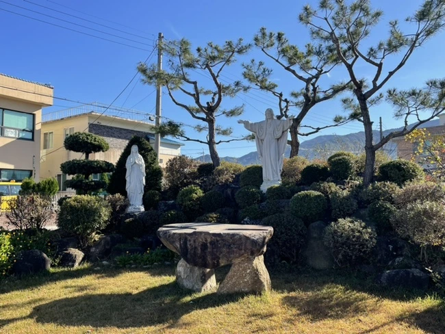 주변 건물이 모두 1층짜리로 낮은 탓에 하늘이 더욱더 높게 느껴졌다. 덕분에 성당을 찾는 일은 어렵지 않았다. 성모상과 잔디마당, 성당 건물에 가까워질수록 발걸음이 가벼워졌다. 성모상 앞에 잠시 멈추어 성모송을 바치고 성당 안으로 향했다.