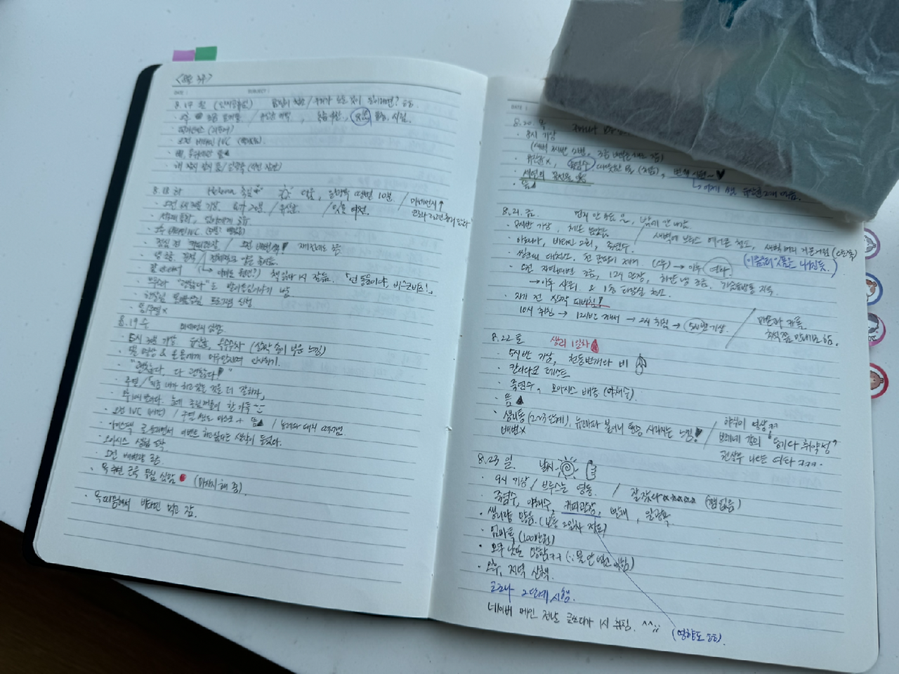 체크리스트 버리는 대신 기록하기 시작했습니다. 틀을 정하지 않고 자유롭게 메모했습니다. 밑줄 만 그어진 노트에 날짜를 적었습니다. 그 아래로 전반적인 컨디션부터 기상 시간, 하루 식사 메뉴, 방귀 횟수와 냄새, 대소변 양상, 커피 관장 느낌, 새롭게 시도한 것, 스쳐 지나간 생각, 산책 코스, 산책 중 본 나뭇잎 모양과 나무 촉감까지. 아주 세세한 것까지 모두 적었습니다.