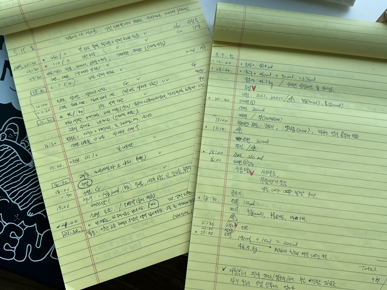 또 한 번 강력한 기록의 힘을 경험한 사례로 수술 후 배뇨 장애를 치료할 때였습니다. 카테터로 자가 도뇨를 한 소변량, 이후 잔뇨량을 시간대별로 확인했지만 하루 6~8번 사이에도 수치가 들쭉날쭉 널뛰었습니다. 약을 얼마나 더 먹어야 할지, 자가 도뇨를 언제까지 지속해야 할지, 의학적 도움이 필요하진 않은지 등 감으로 판단하기 어려웠습니다. 4주간 수치를 기록하고, 표로 정리해 보니 그래프를 그려볼 필요도 없이 쉽고 빠르게 추이를 확인할 수 있었습니다. 담당 교수는 제가 가져간 기록을 보며 처방해주기도 했습니다.