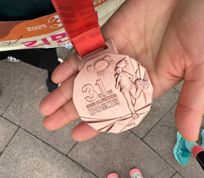 5km 시작점 대기 줄에 서서 제자리 뛰기를 이어갔습니다. 추운 날씨에 새끼발가락 감각이 무뎌졌습니다. 코끝은 빨개지고 어깨가 움츠려 들었습니다. 삼일절 태극기 무리에 둘러싸여 심장이 쿵더쿵 떨렸습니다. 힘들면 지금처럼 제자리 뛰기를 하자는 마음으로 출발했습니다. 연습할 때는 500m쯤 위기가 찾아왔는데, 현장에서는 여럿이 함께 뛰니 힘든 줄 모르고 뛰었습니다.