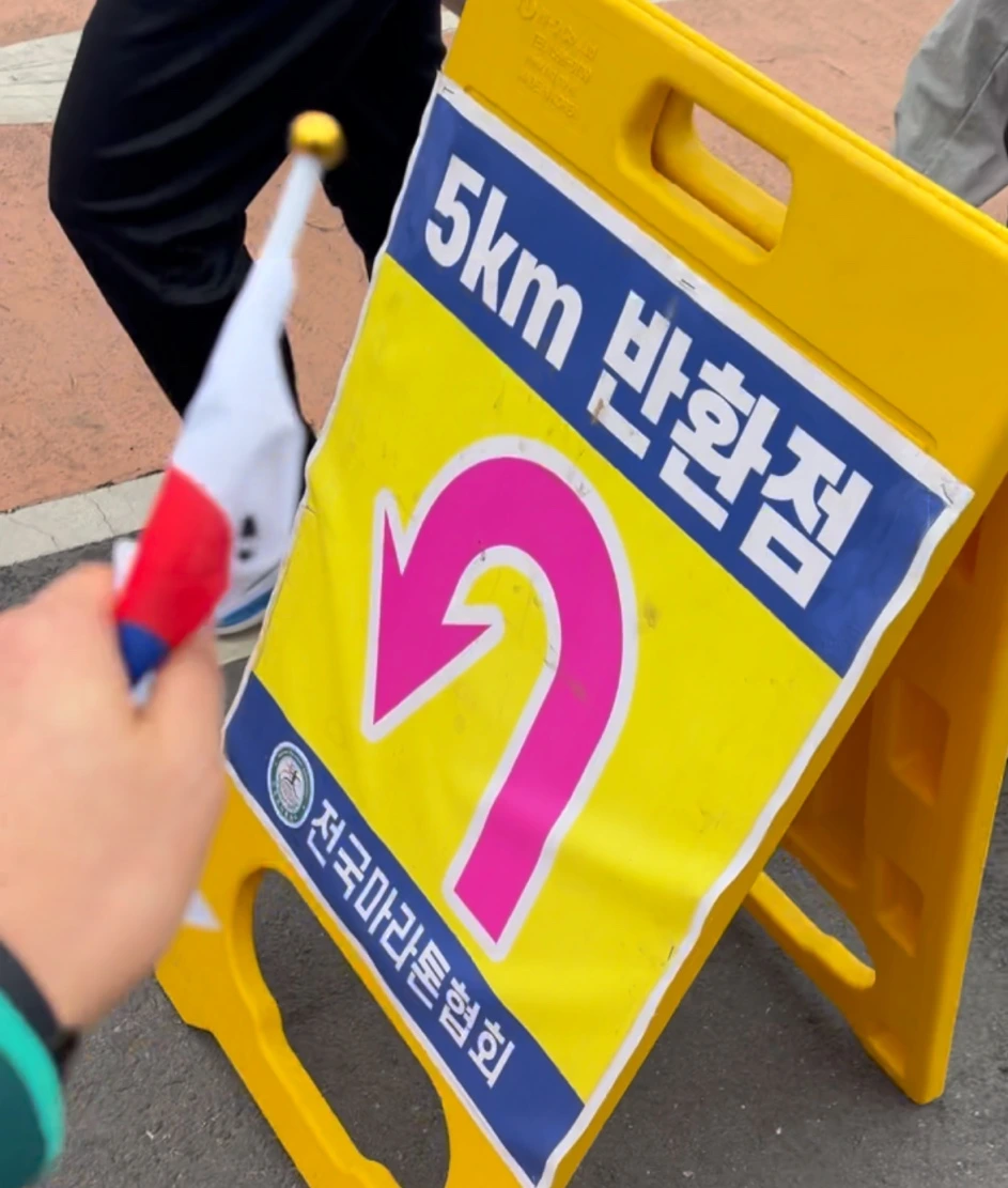 2.5km 반환점 사인이 보였을 때, 25km를 뛴 사람처럼 기뻐하며 소리쳤습니다. 그러나 반환점을 지난 후 급격히 힘들었습니다. 이미 최고 기록을 넘긴 상태. 주변에 뛰는 참가자 수가 줄었고, 걷는 사람도 많았습니다. 그래도 옆에서 페이스를 맞춰 준 남편 덕분에 멈추지 않고 뛰었습니다.