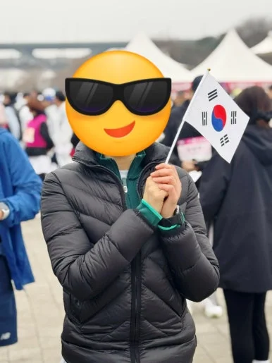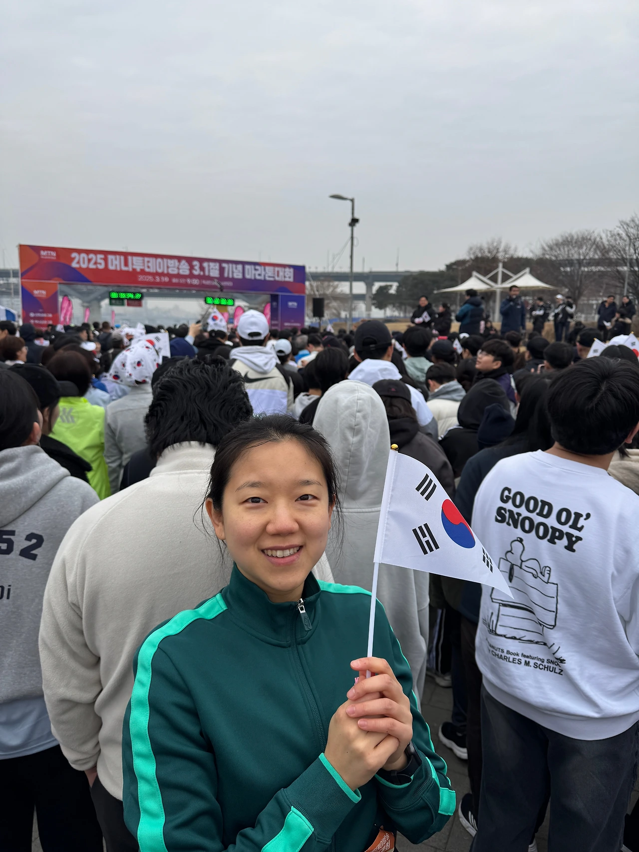 마라톤 당일까지도 2km 이상을 뛰어본 적이 없는 상태로 출전했습니다. 날이 많이 풀린 편이었지만, 해가 뜨지 않아 쌀쌀하고 흐린 날이었습니다. 차가운 바람에 겉옷을 벗기 망설여지고, 애써 태극기만 힘차게 펄럭였습니다. 이 많은 사람들이 이른 아침부터 자발적으로 모였다는 게 신기했습니다. 뛰기 위해서요! 구령에 따라 몸풀기를 하면서 이미 완주에 성공한 모습을 상상하고 기념사진부터 찍었습니다.