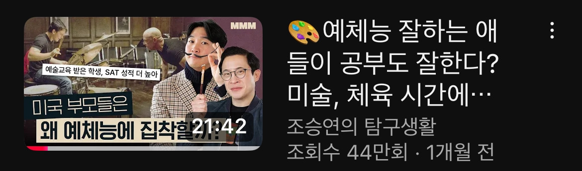 그런데 저와 저희 세대는 기본 소양 교육을 받지 않았고 그나마 있던 예체능 시간에는 다른 공부를 해도 되는 자율학습 시간이 되어버렸었습니다.