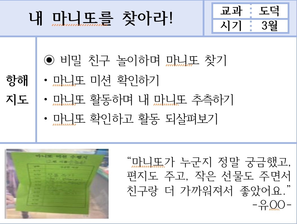 열흘 간의 마니또 활동 기간 동안 아이들은 활동 그 자체로 설레어했다. 나를 마니또로 뽑은 친구가 누구일지 추측하며 친구들의 행동에 관심을 가지고, 나의 마니또를 기쁘게 하기 위해 나의 나의 소중한 시간과 자원을 나눠주기도 하였다.