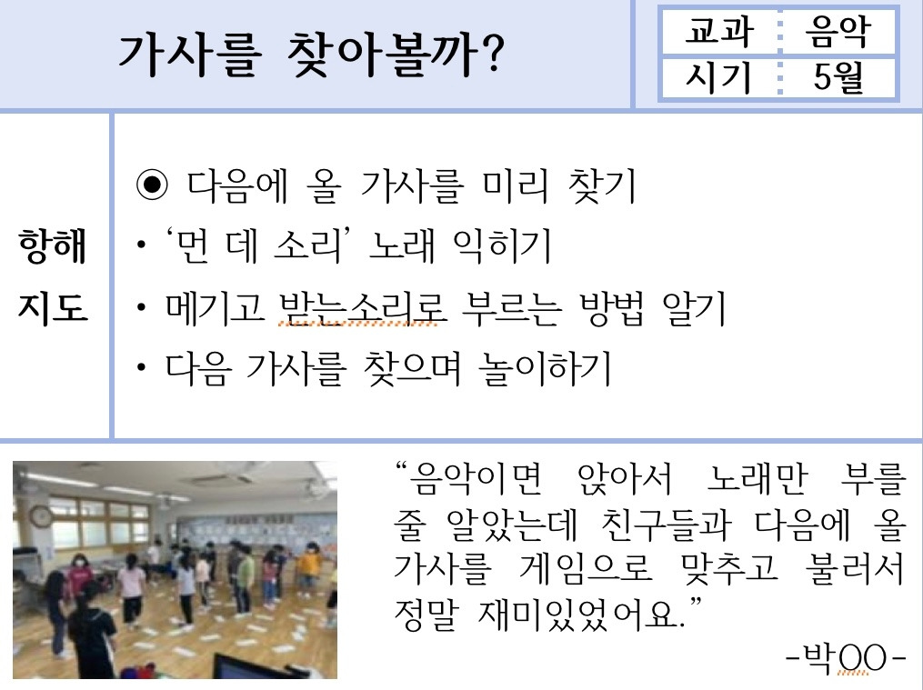 코로나로 인해 투명 가벽이 설치된 책상에서 한 줄 배열로 공부하는 아이들에게 짧은 해방감을 선물하기 위해 놀이 활동을 음악 수업과 융합하였다. 메기고 받는 노래를 익힌 후에 노래를 부르며 다음 가사를 바닥에서 찾아 그 자리로 이동하는 놀이를 구상하였다. 노래를 부르는 것을 좋아하지 않거나 힘들어하던 학생들도 놀이와 결합하니 적극적으로 참여하였고, 충분한 가사지를 바닥에 배열하여 경쟁이 아닌 협력의 놀이가 되었다.