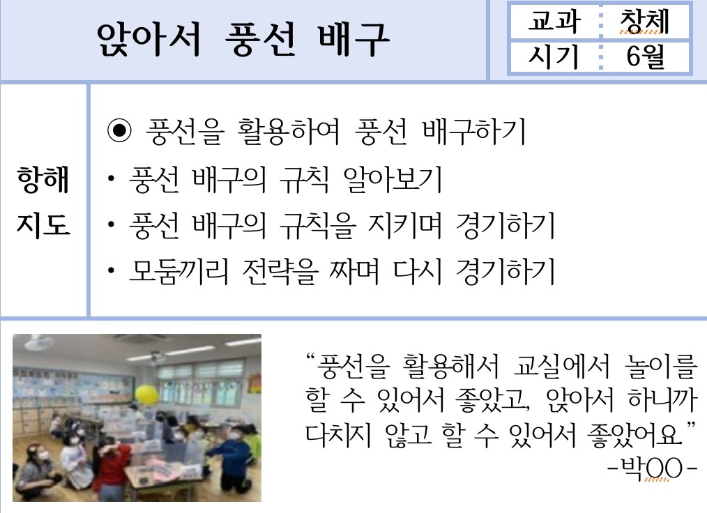 활달하고 에너지가 넘치는 반 아이들에게 쉼을 주고 싶어서 교실에서 할 수 있는 놀이인 풍선 배구를 소개하였다. 책상을 이용해서 팀별 공간을 만들고 풍선이 바닥에 닿지 않도록 모둠원끼리 협력하는 놀이이다. 신체활동이다 보니 안전사고의 우려가 있어 경기 시작 전, 규칙을 함께 정하였다.