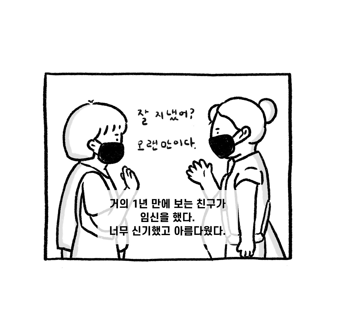 그렇게 친구는 결혼하고 자주는 아니지만 종종 연락을 주고받으며 만나자 만나자 약속만 하다가 지난 주말에 1년 만에 친구를 만났다. 만나기 전에 임신 소식을 듣고 무엇을 선물하면 좋을까 많이 고민했다. 의미 있는 선물을 하고 싶었다. 귀여운 아기 옷을 사고 싶었지만 그냥 작은 턱받이 2개와 동화책, 그리고 직접 그린 그림을 준비했다. 동화책은 약속 전날에 생각난 책이라 약속 당일 아침에 서점에 가서 샀다. '우리는 언제나 다시 만나'라는 동화책인데 미혼인 나도 눈물이 고인 책이었다. 그래서 엄마가 되는 친구에게 더 의미 있을 거라 생각하며 동화책도 준비했다.