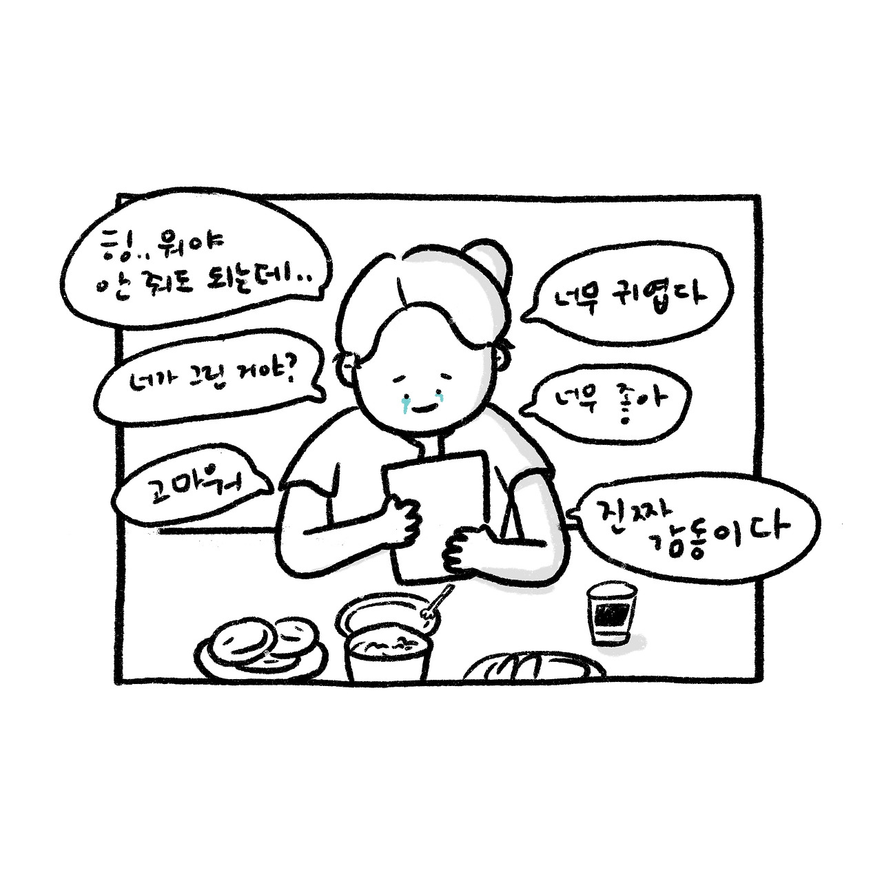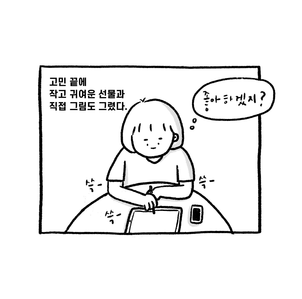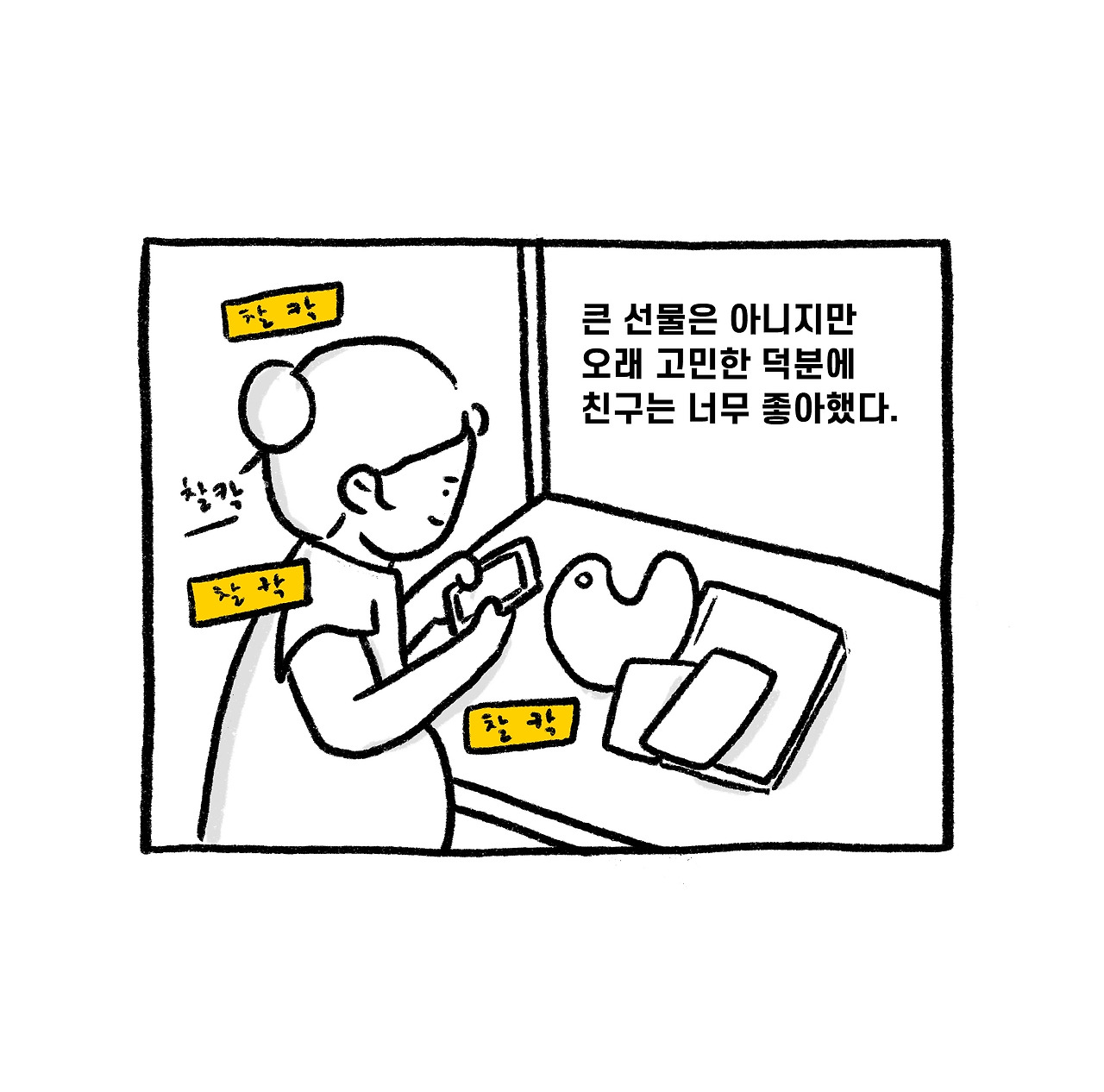 나는 친구에게 빨리 선물을 주고 싶어서 카페에 도착 하자마자 선물을 내밀었다. 예상치 못한 선물에 친구는 너무 좋아해 줬다. 꽤나 오랫동안 준비한 덕에 나까지 기분 좋은 선물이 되었다. 더구나 직접 그린 그림이 너무 귀엽고 고맙다고 계속 사진을 찍었다. (내 그림을 예뻐해 주는 사람 최고!) 그림을 아무 대가 없이 선물한다는 것은 내 기준으로 마음을 담아 주는 것이라 생각을 한다.
