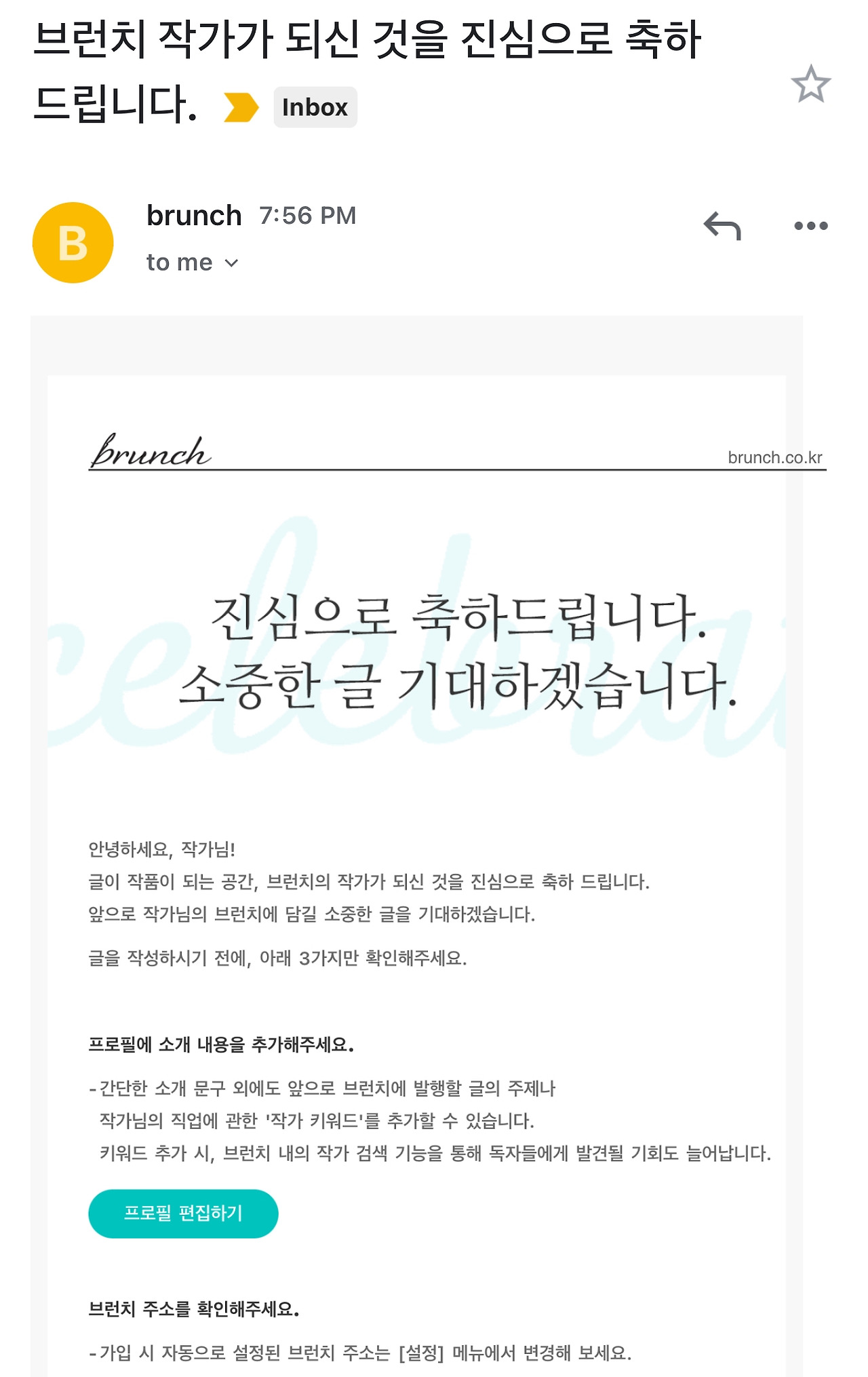월요일 저녁 무렵에 이메일이 하나 날아들었다. 브런치에서 온 것이었다.