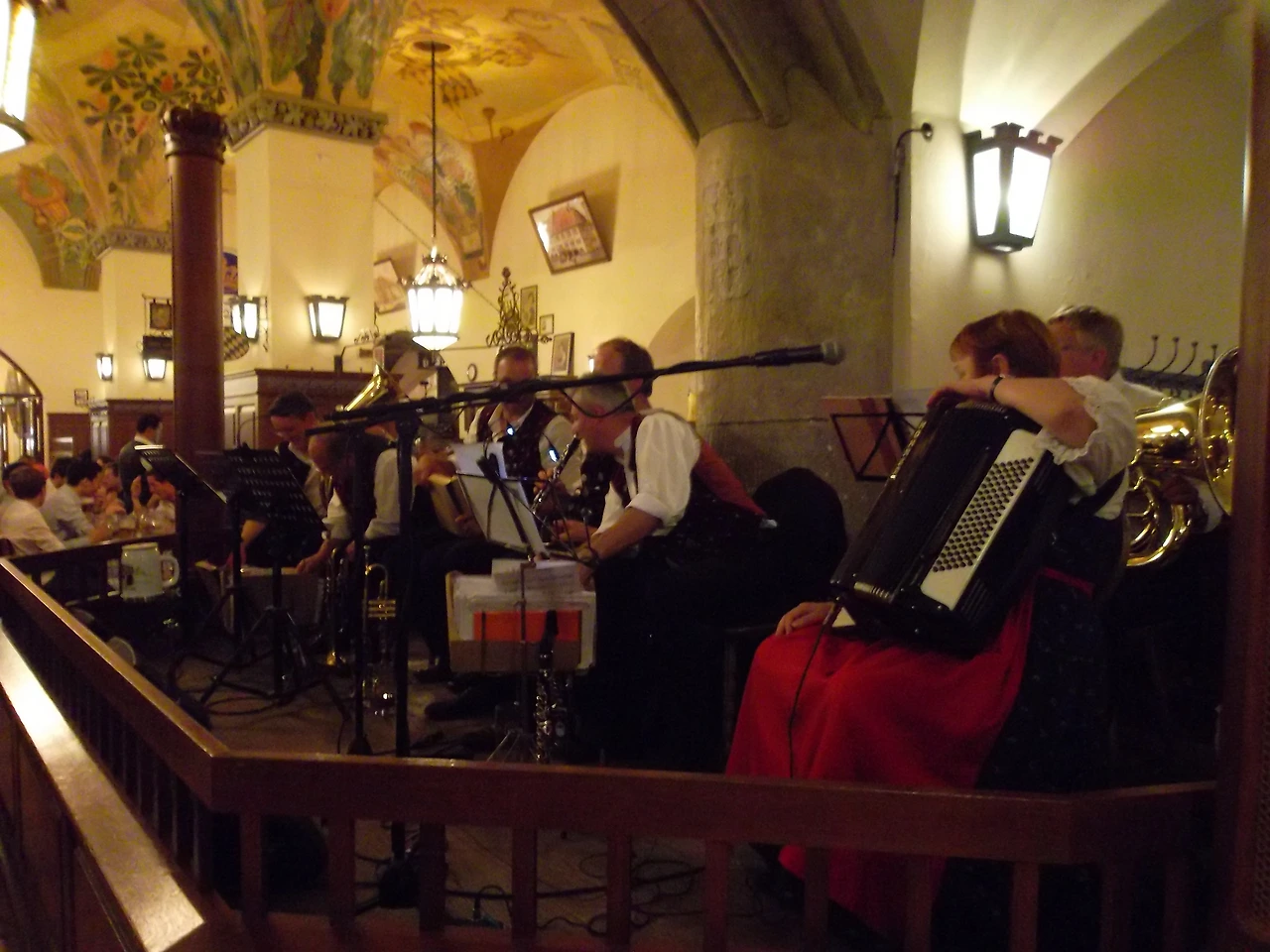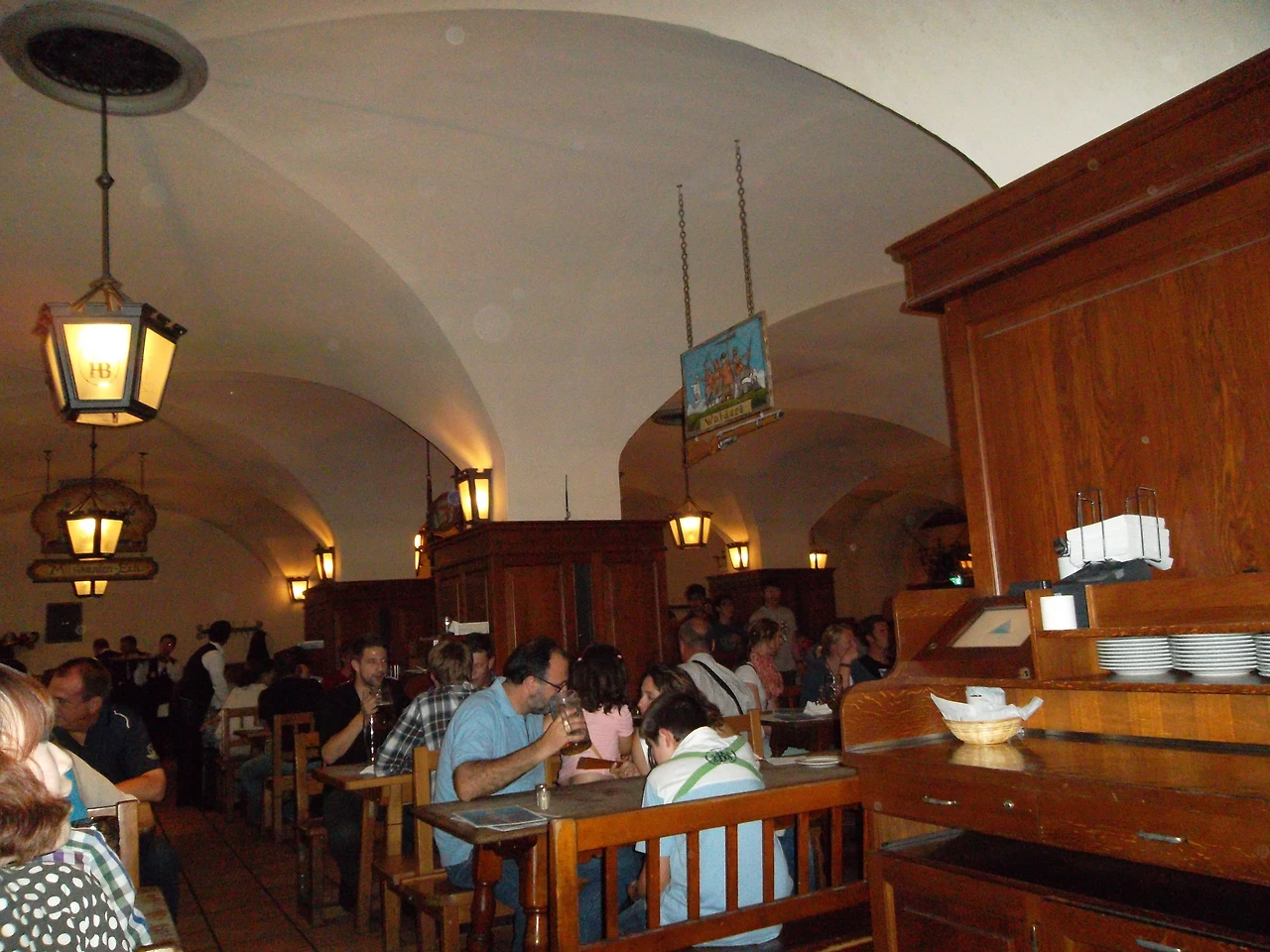 그 친구들은 흔쾌히 좋다고 대답했고 우리 셋은 호프브로이로 들어가서 크고 긴 테이블로 안내받았다. 호프브로이의 내부는 엄청나게 넓었다. 지상 최대의 펍이라는 것이 실감이 났다. 체리색 나무 벽면에 나무 몰딩이 장식되어 있고 하얀 천장은 아치형으로 기둥과 곡선을 이루고 있어서 동굴에 들어온 기분이 약간 들었다. 한쪽에서는 악단이 독일 민요 같은 것을 연주하고 있었는데, 내부가 워낙 시끌벅적해서 거리가 좀 떨어진 테이블에서는 잘 들리지 않았다.