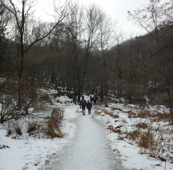 추운 겨울에는 눈 내린 날이 한참 지나도 사이사이 등산로는 어김없이 눈길이었다. 우리는 단돈 오천 원짜리 아이젠을 등산화에 끼우고 눈길과 얼어붙은 흙길에 구멍을 내며 걸었다.