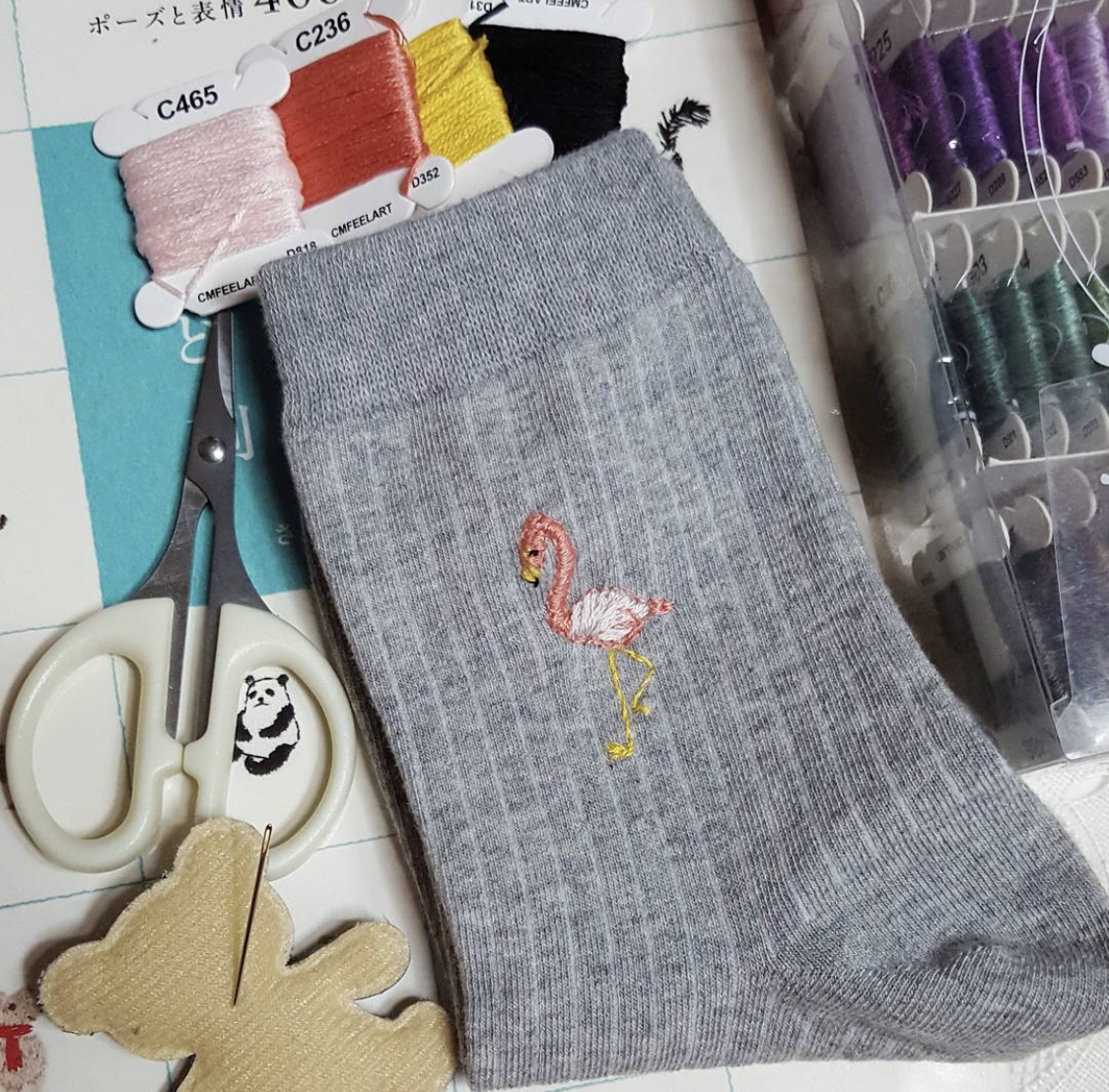 결과물이 남는 취미라면 개인적으로 실용적인 것을 선호하는 편이라 양말의 발목 부분에 자수를 놓았다. 두어 켤레는 선물로 지인에게 줬는데, 나머지는 들인 정성 때문에 한 번도 신지 못했다. 지금 생각해보니 정말 실용성이 떨어지는군?
