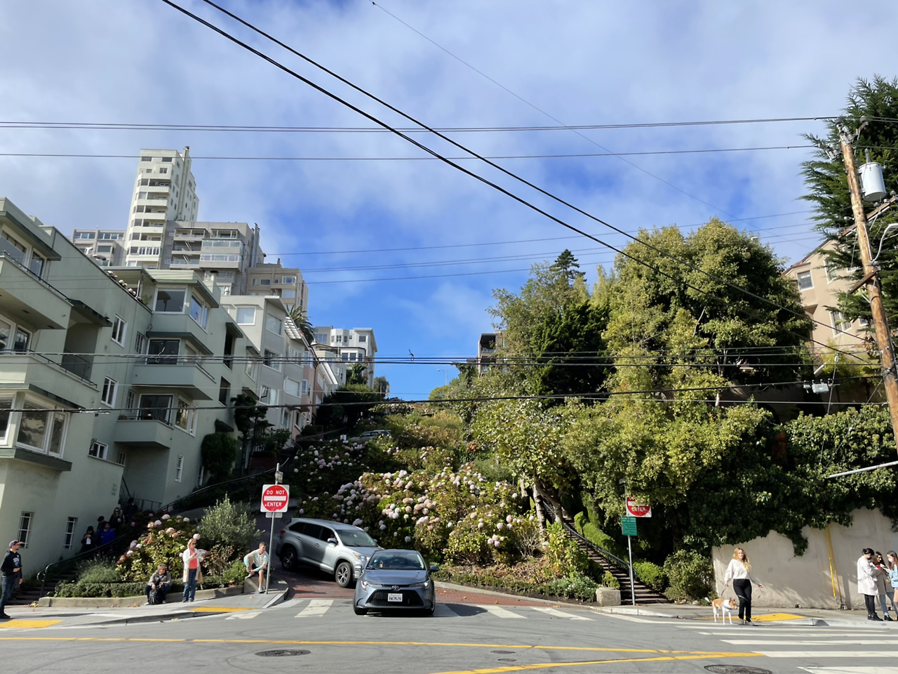 롬바드 스트리트 : 샌프란시스코에서 가장 유명한 가파른 경사로이다. 약 27도로 기울어져있으며 안전을 위해 S자 모양으로 도로가 나있다. 길 사이사이에는 수국을 비롯한 다양한 꽃들이 심어져 있고 가파른 경사만큼이나 도심이 잘 내려다보여서 관광객들에게 포토스폿으로 큰 인기가 있다.