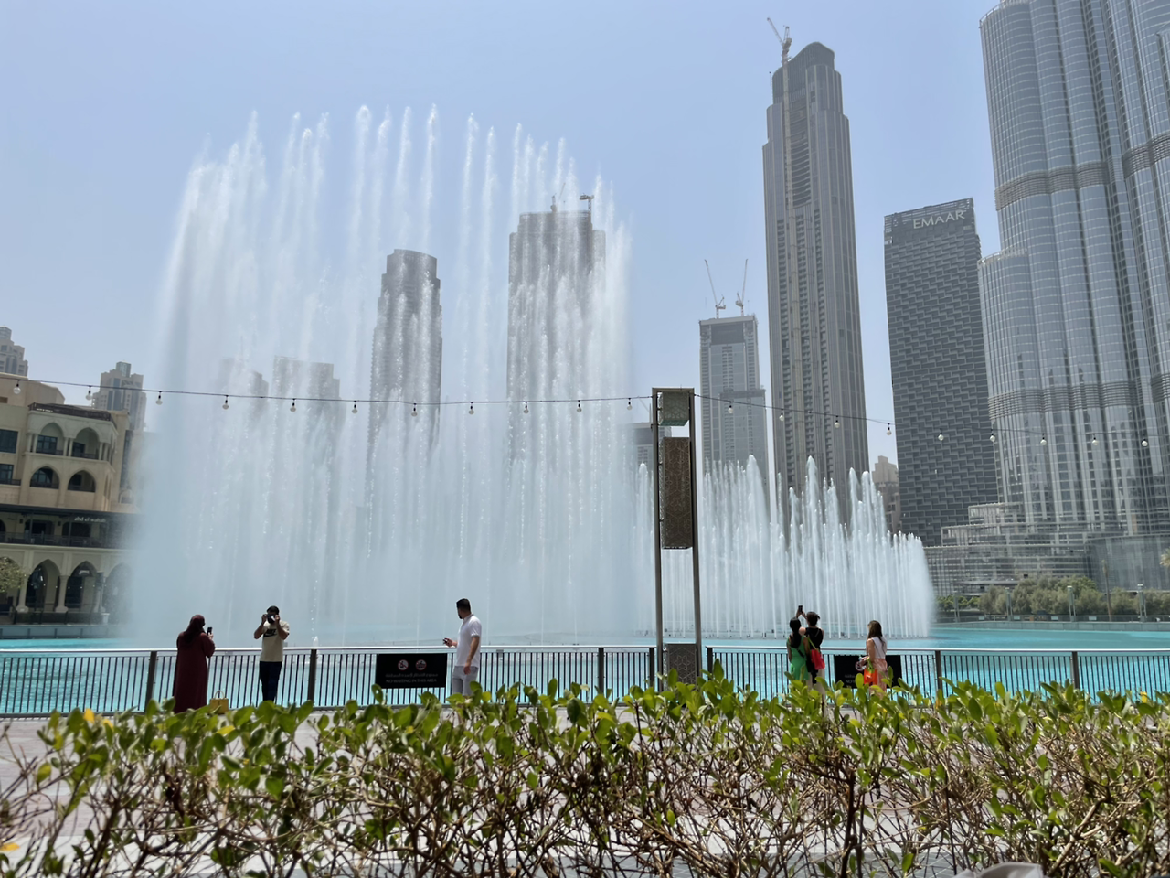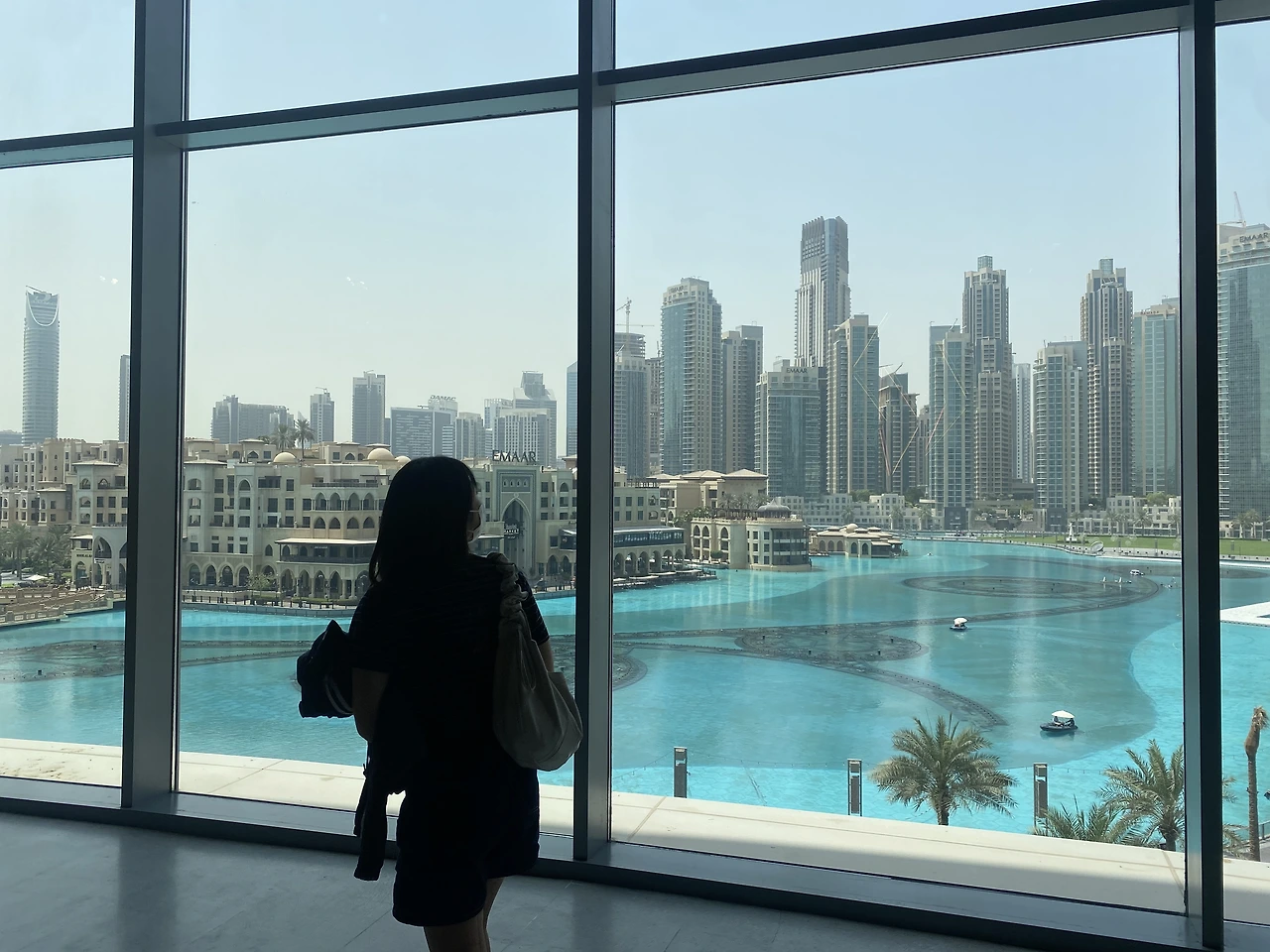 두바이몰은 너어얿었다. 매장들만 봐서는 여의도 더현대나 하남 스타필드와 크게 다를 게 없다고 느꼈다. 그리고 그때마다 하얀 원피스를 입은 남자들이 나타나서 여기가 두바이라는 것을 자꾸만 상기시켜줬다. 샤넬과 구찌 따위의 (나에게는 없지만)어딜 가나 있는 명품 매장을 지나서 분수대를 향해 걸어갔다. 파란 분수는 잠잠했다. 춤을 추는 걸 보기엔 이른시간이었다. 우리는 한시까지 기다려야만 했다. 햇빛에 눈을 찌푸리며 고개를 꺾어 부르즈 칼리파의 꼭대기를 봤다. 너무 높아서 함께 찍은 사진마다 그 꼭대기는 모두 잘려있었다.